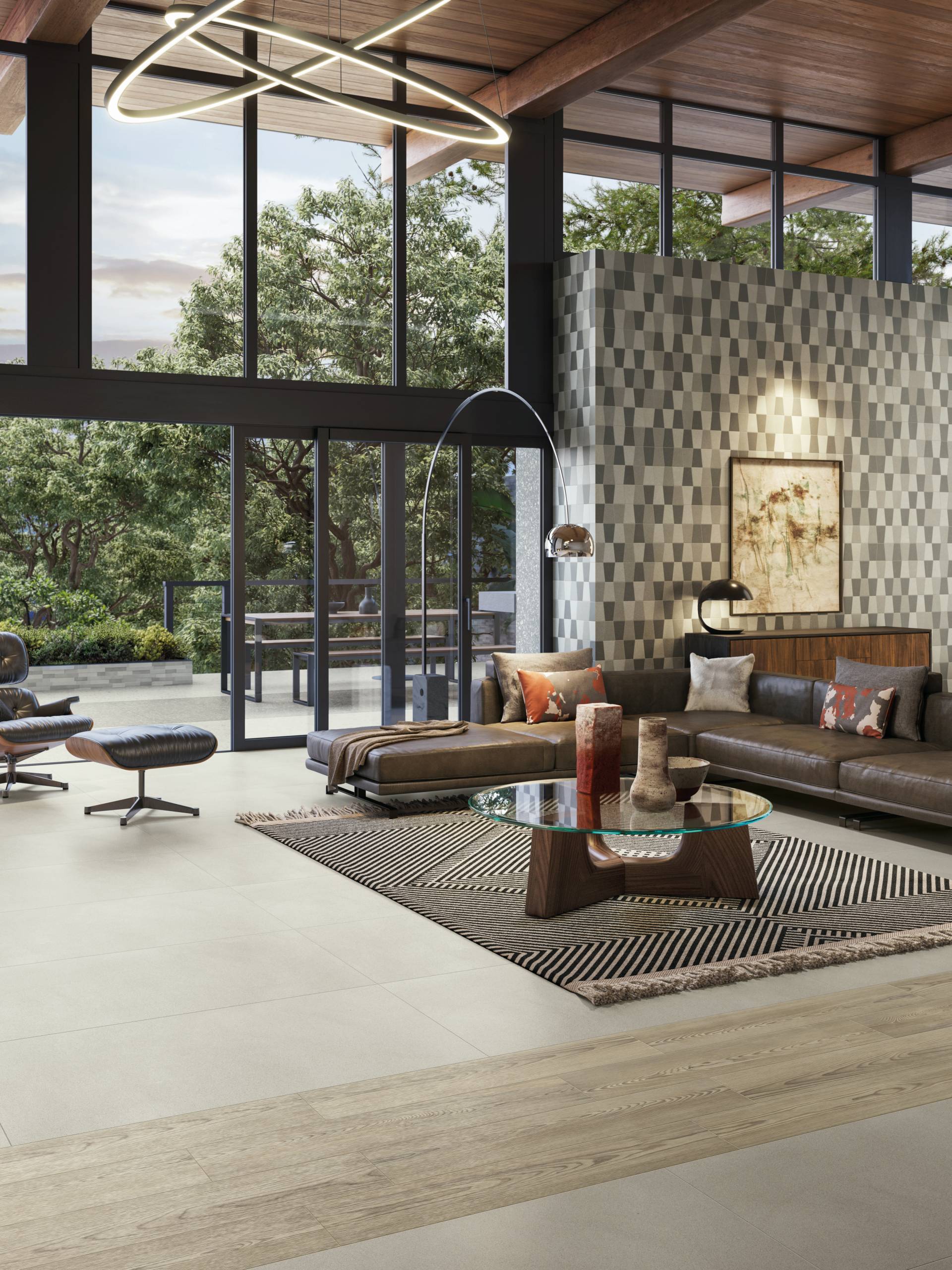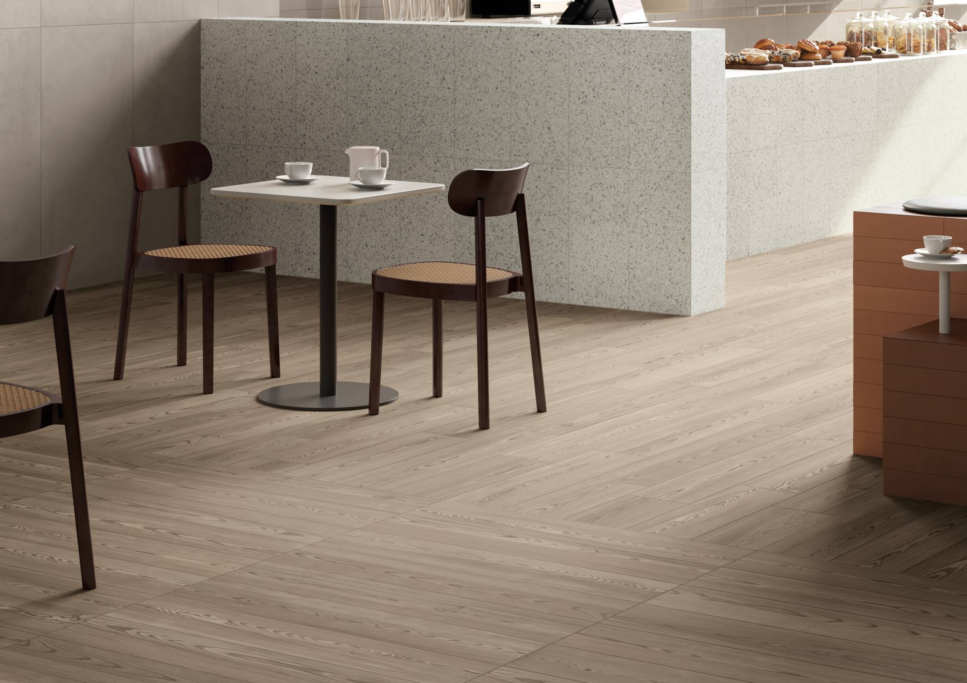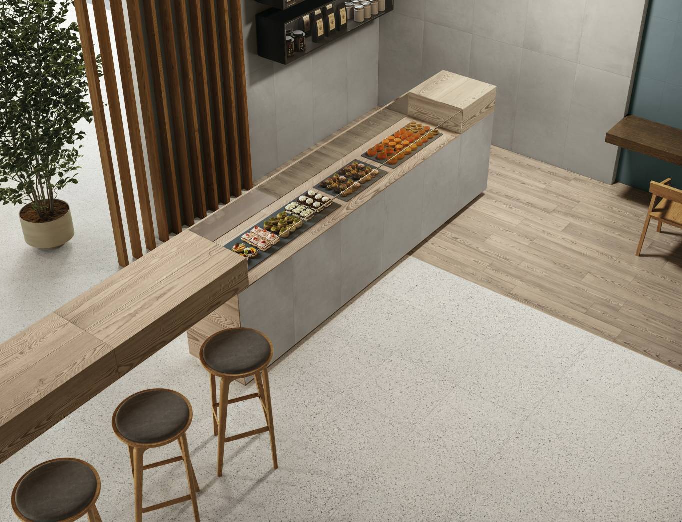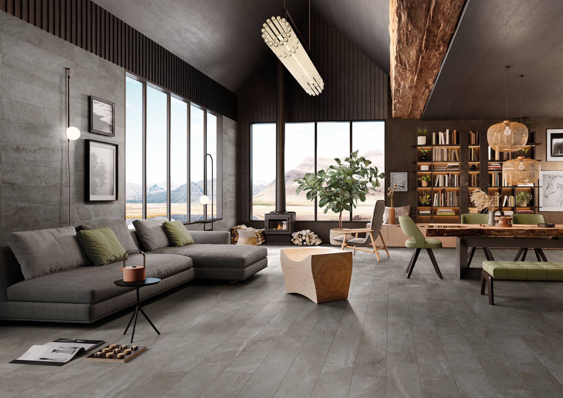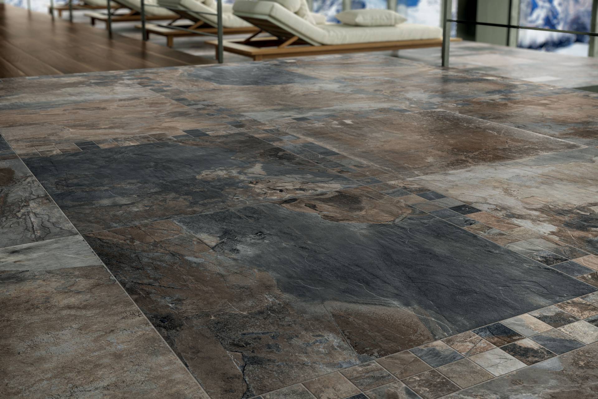 A complete surface system made to combine and mix contemporary looks such as wood, fabric, resin, terrazzo and stone looks, vivid colors, mosaics, and decors.