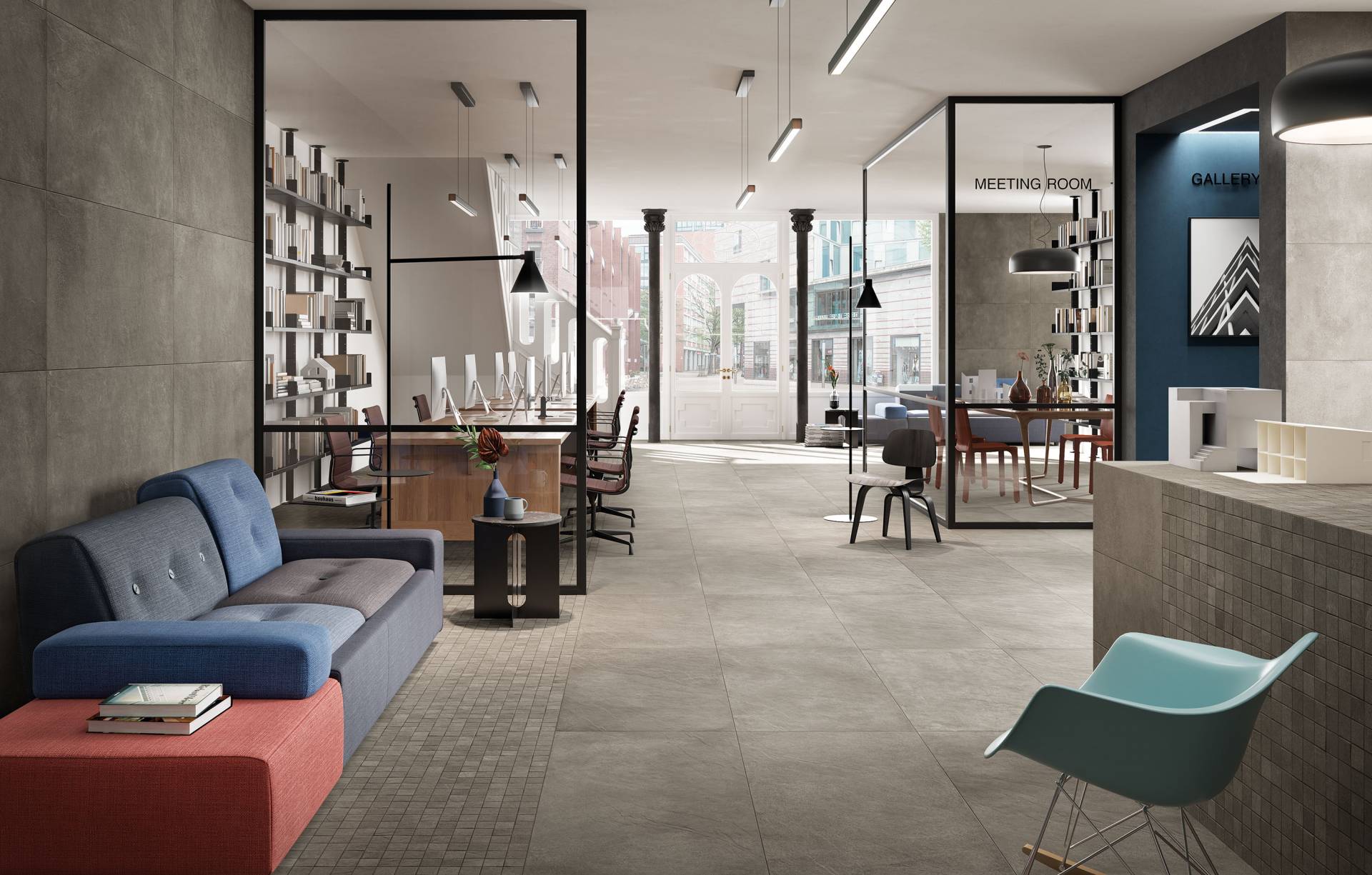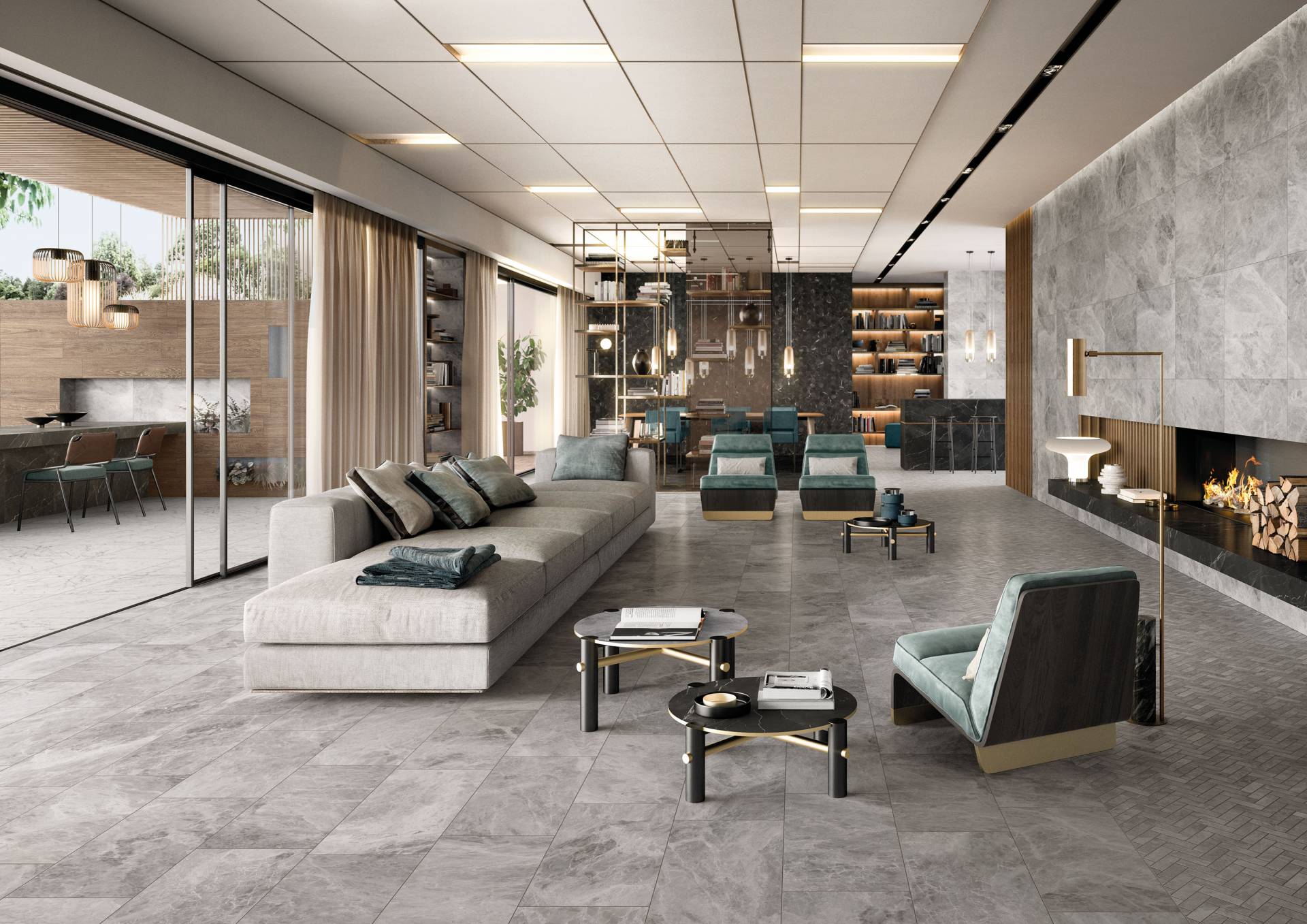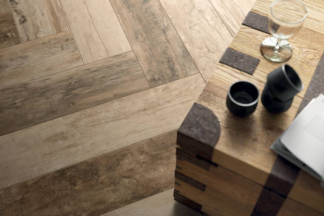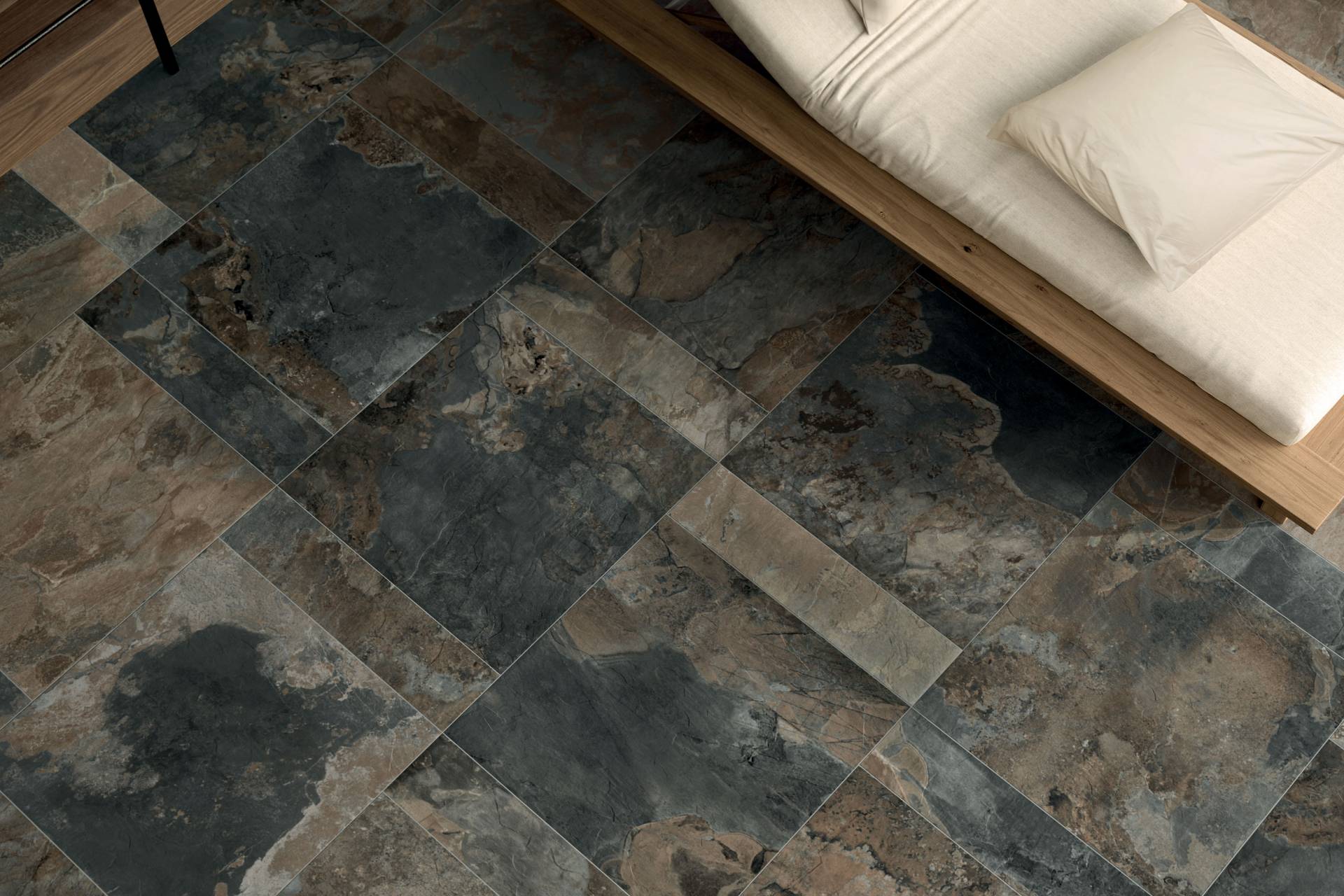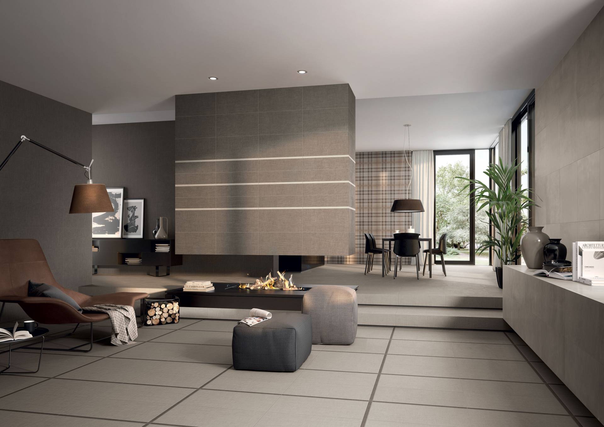 A complete surface system made to combine and mix contemporary looks such as wood, fabric, resin, terrazzo and stone looks, vivid colors, mosaics, and decors.