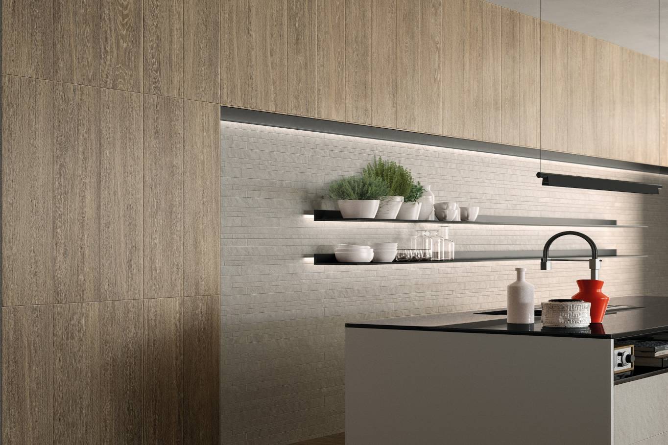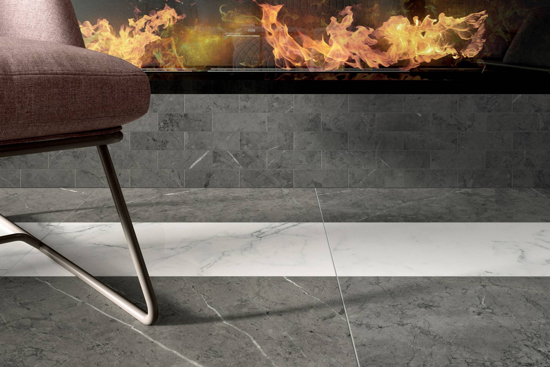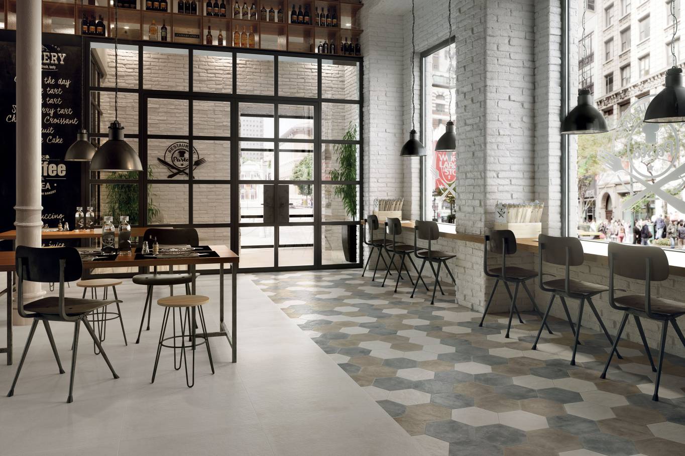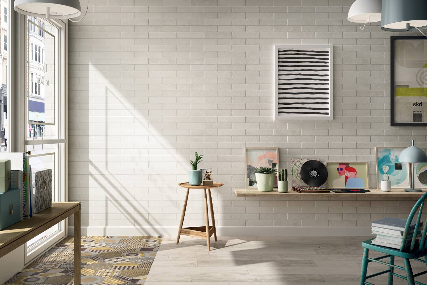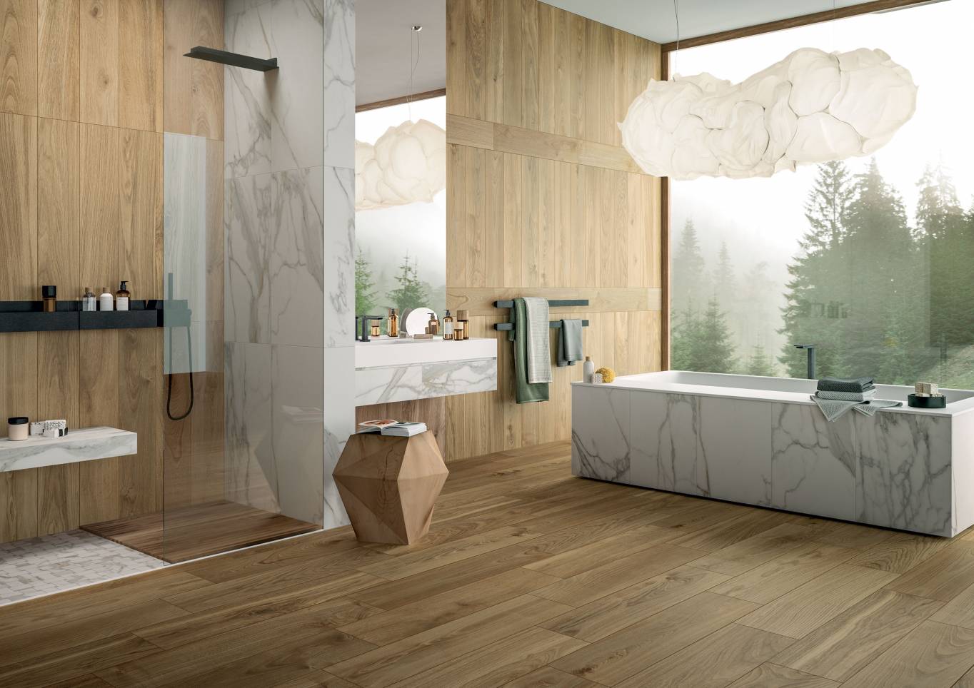 A complete surface system made to combine and mix contemporary looks such as wood, fabric, resin, terrazzo and stone looks, vivid colors, mosaics, and decors.