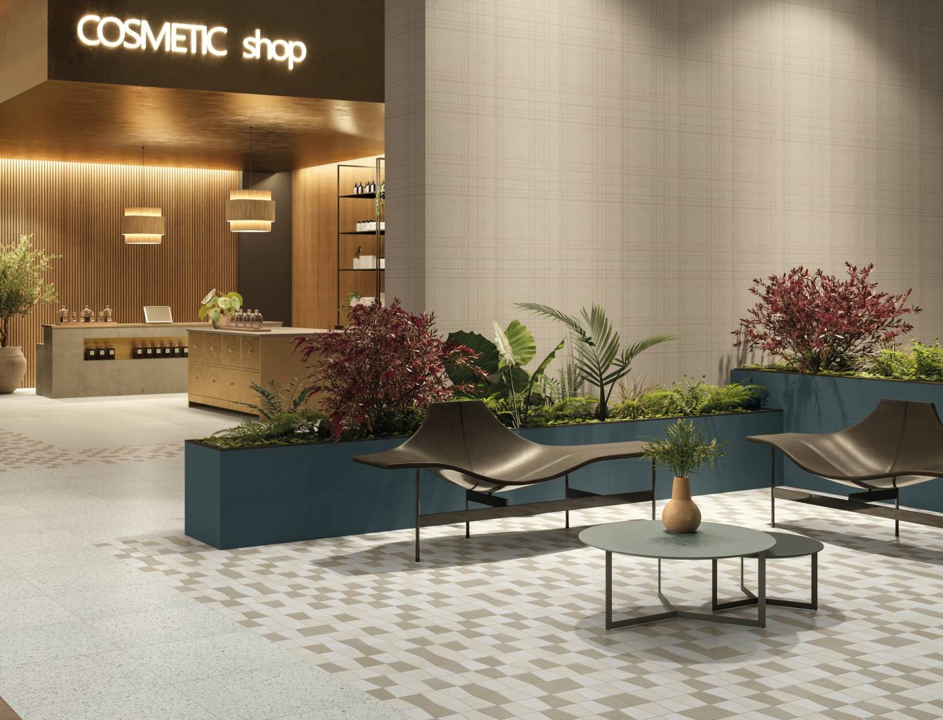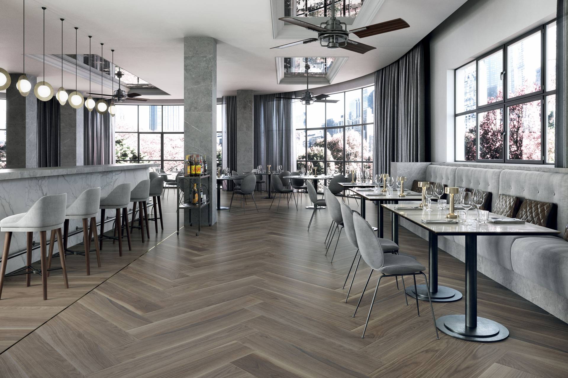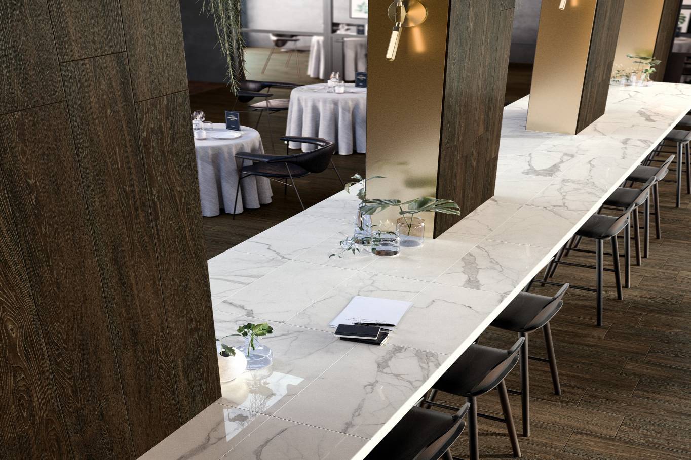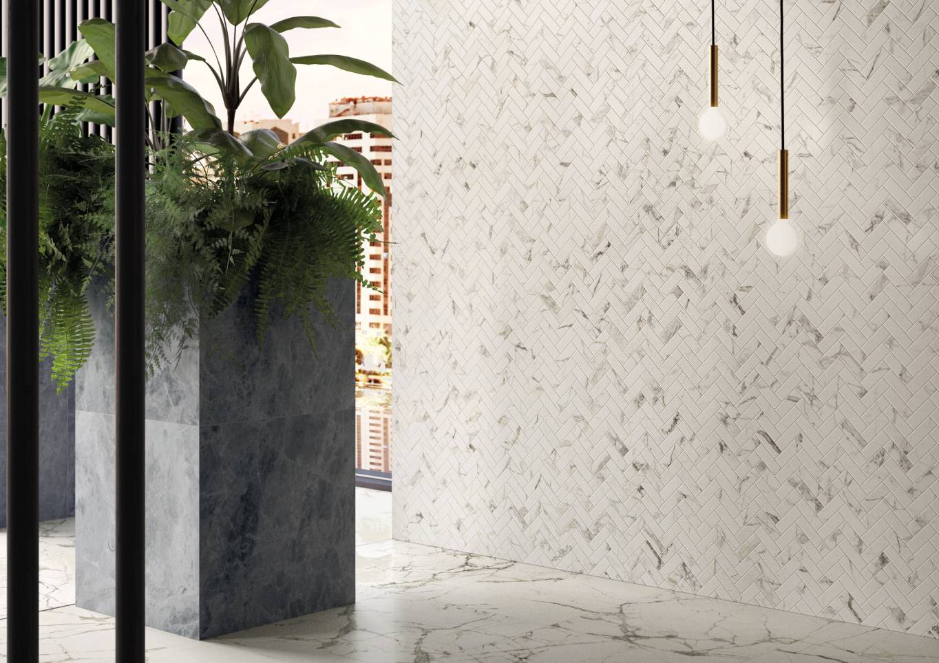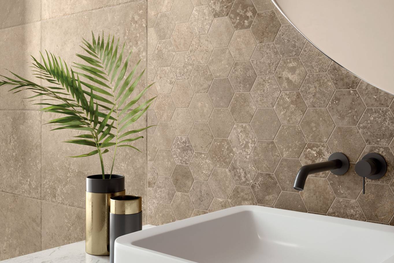 A complete surface system made to combine and mix contemporary looks such as wood, fabric, resin, terrazzo and stone looks, vivid colors, mosaics, and decors.