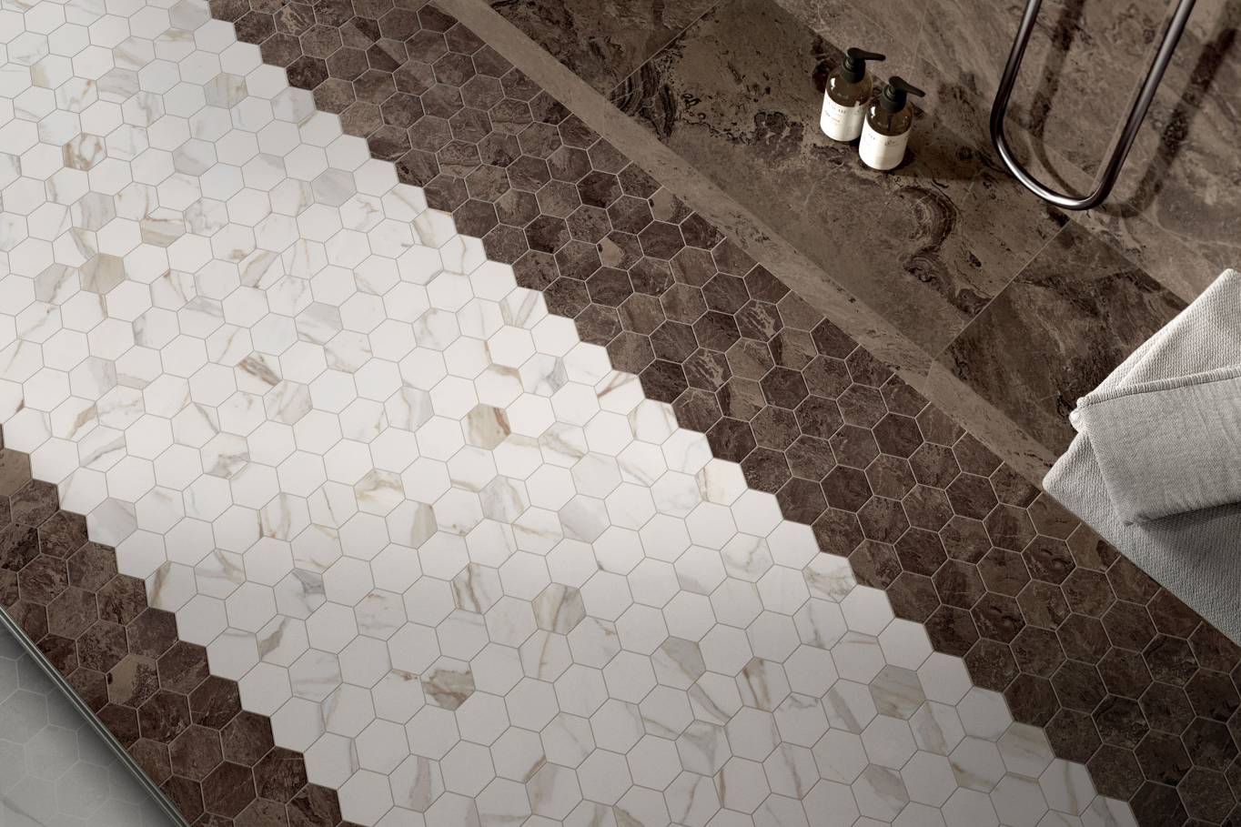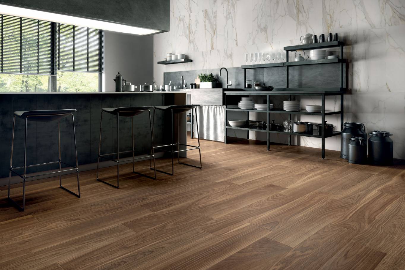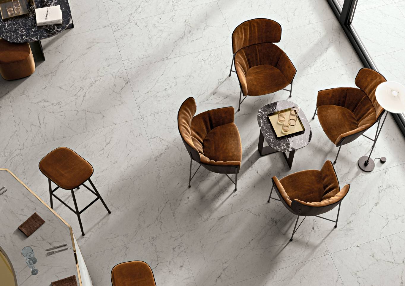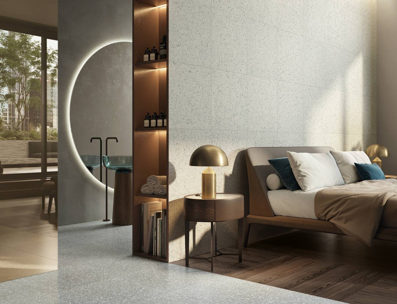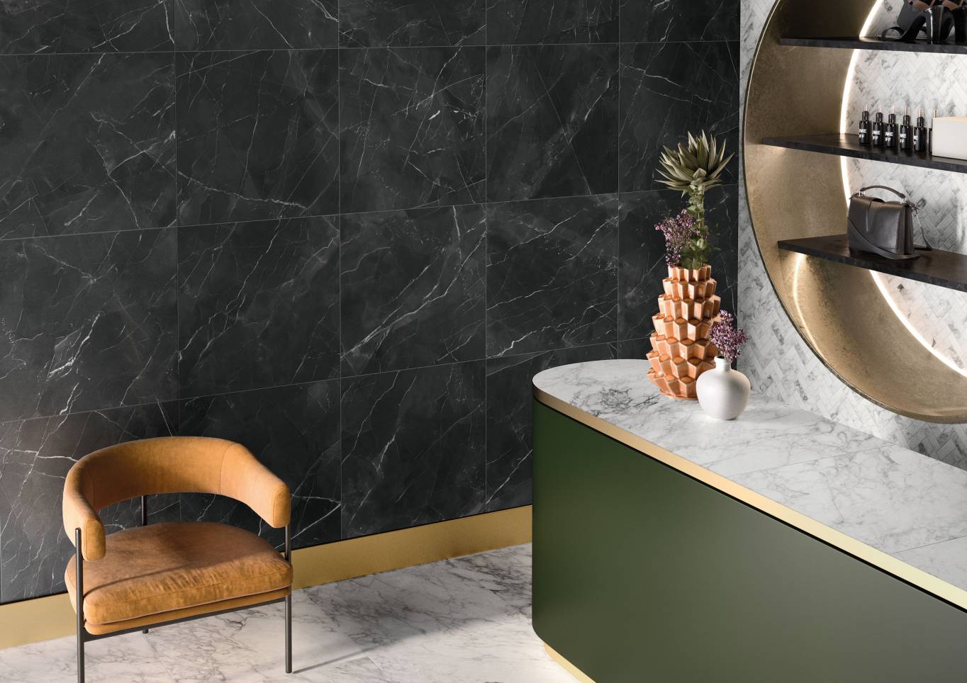 A complete surface system made to combine and mix contemporary looks such as wood, fabric, resin, terrazzo and stone looks, vivid colors, mosaics, and decors.