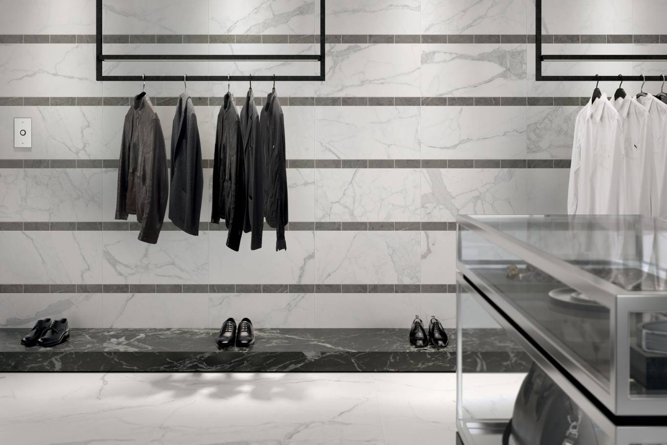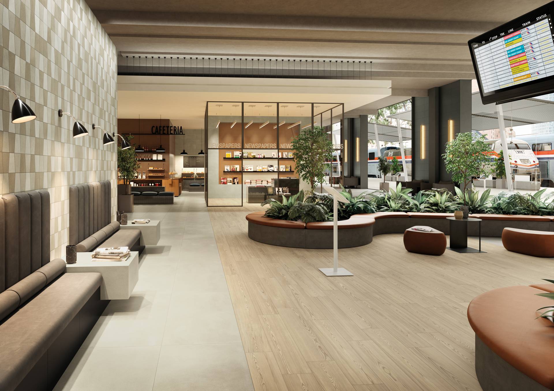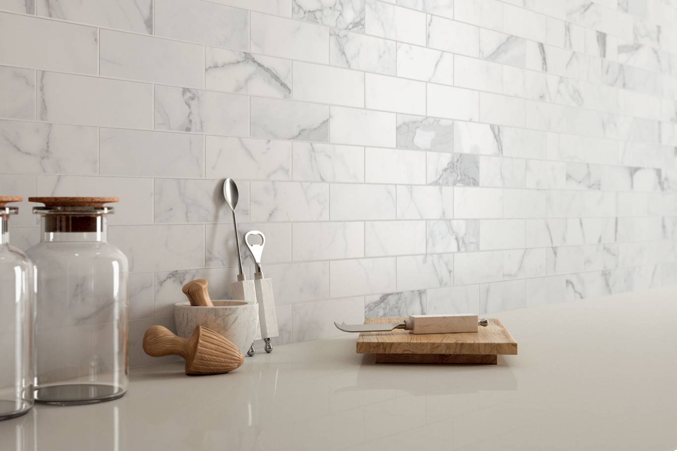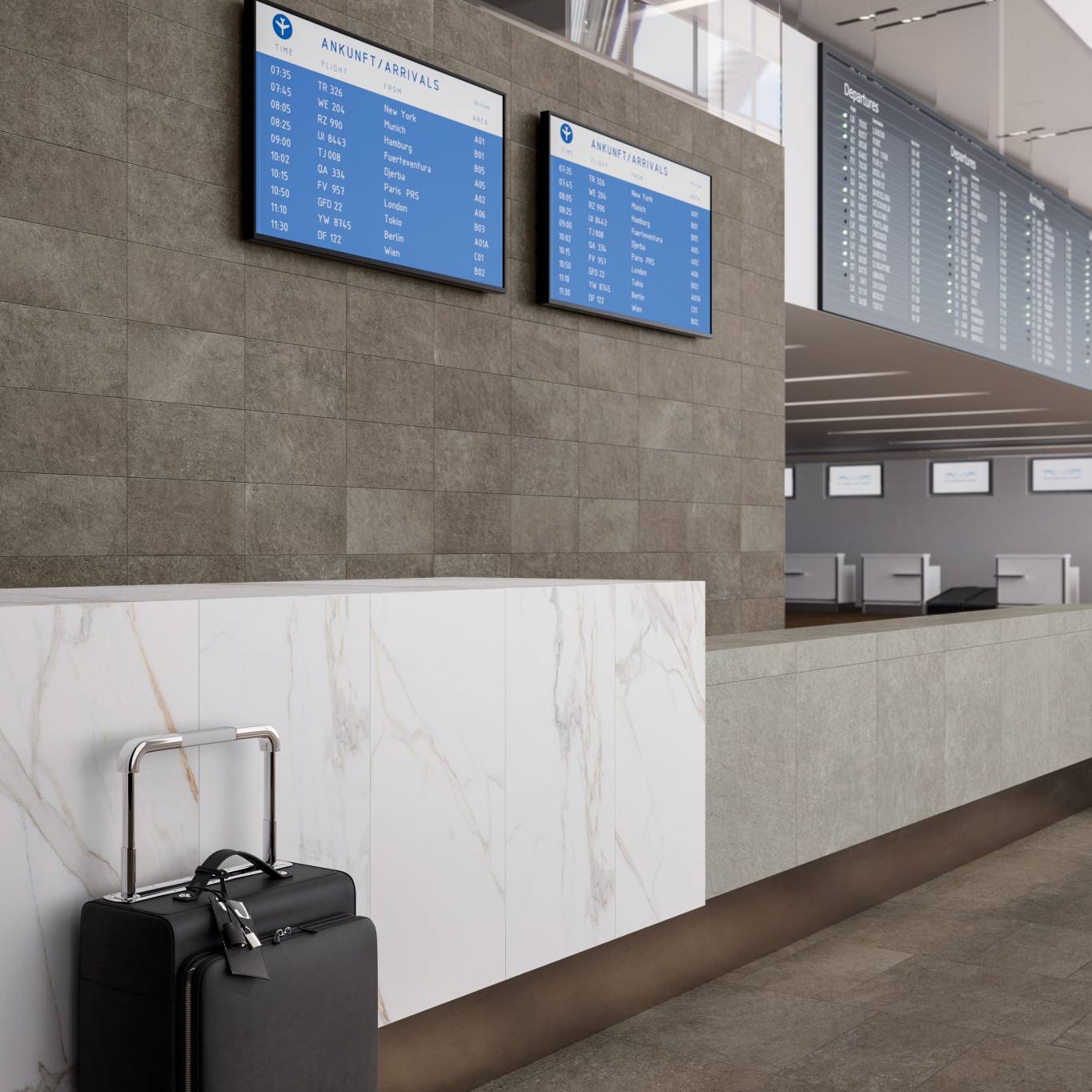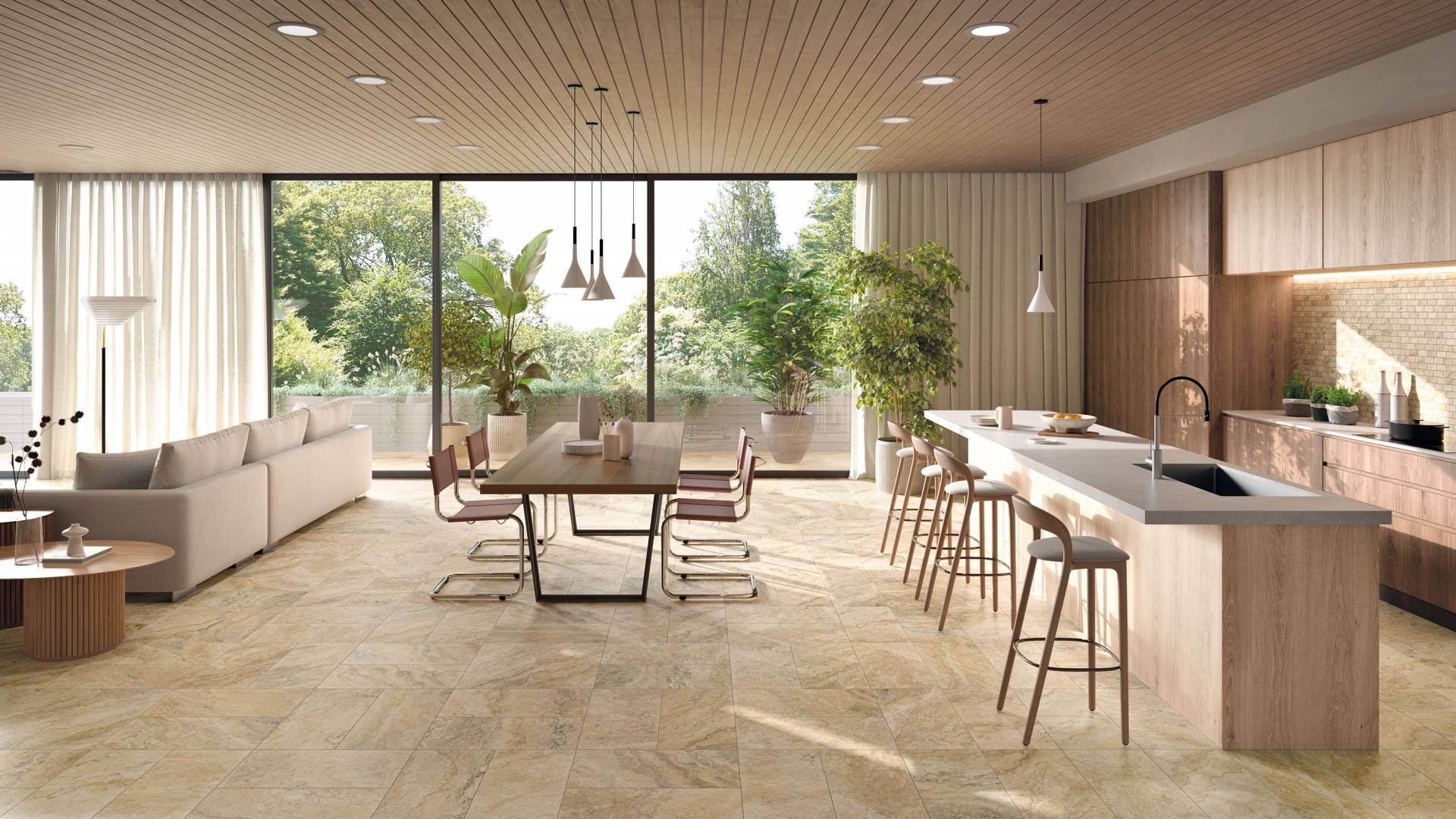 A complete surface system made to combine and mix contemporary looks such as wood, fabric, resin, terrazzo and stone looks, vivid colors, mosaics, and decors.