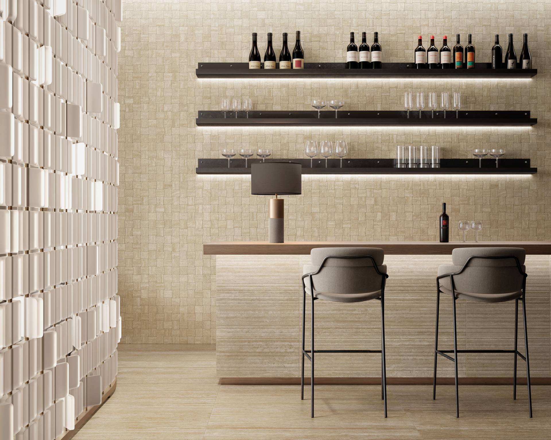 Atelier introduces a new dimension to Veneer World with its sophisticated three-dimensional surface design. Thin lines of varying thicknesses, shapes, and dimensions create a harmonious interplay of textures.