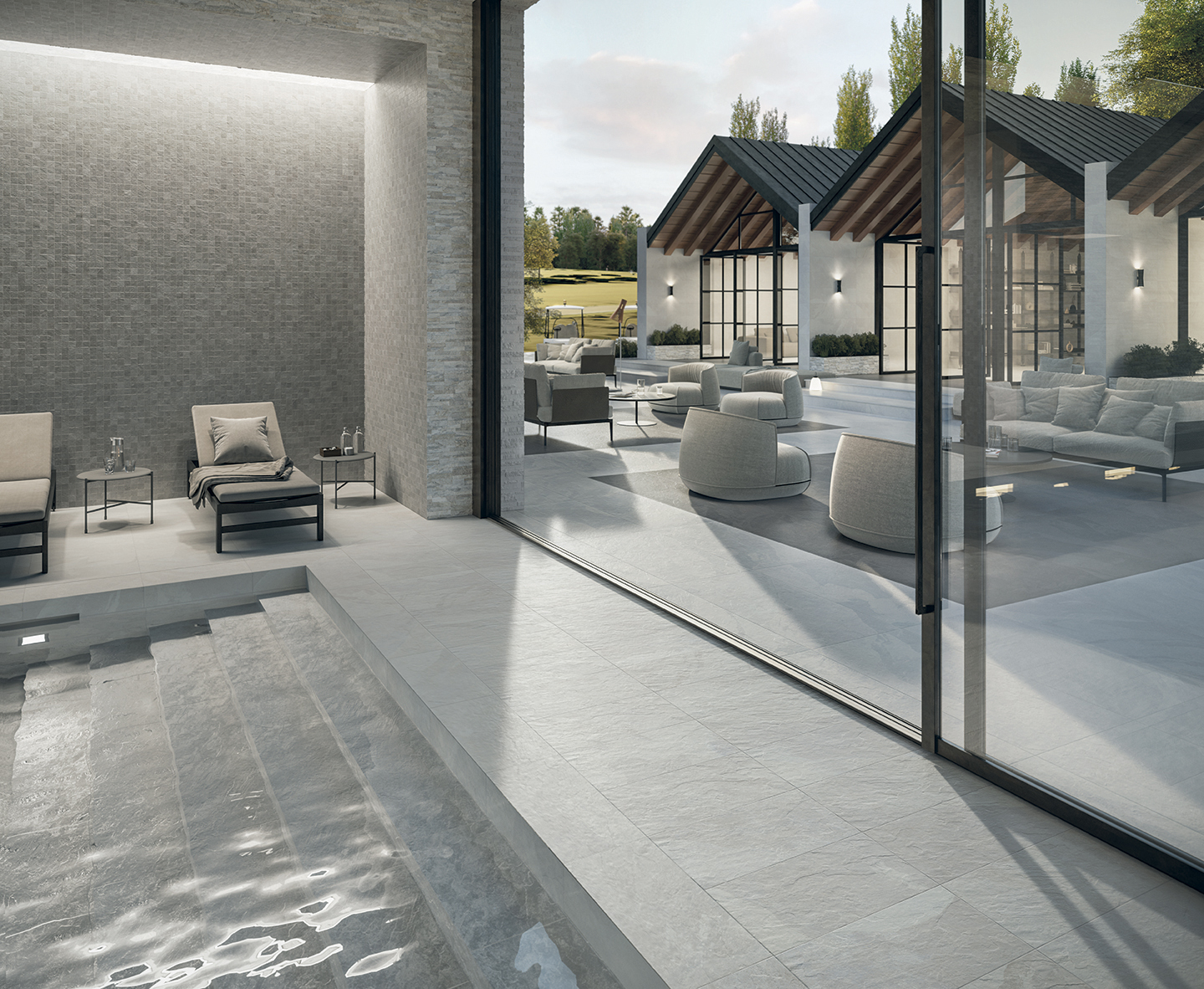 Essence captures the spirit of natural slate, a sedimentary rock renowned for its aesthetics and importance in American architecture. The collection embodies two distinctive personalities, one featuring a tone-on-tone graphic and the other an enriched pattern, to design a total stone look for both indoor and outdoor applications.