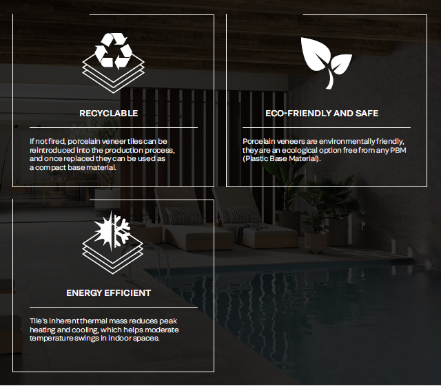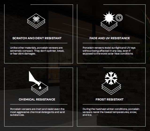 Porcelain veneers last forever. Combining an eye-catching look with maximum durability, they ensure a beauty that resist to any type of stress, bumps and scratches. Tiles surface offers technical superior performance under any environmental conditions, from the scorching heat to the lowest winter temperatures.