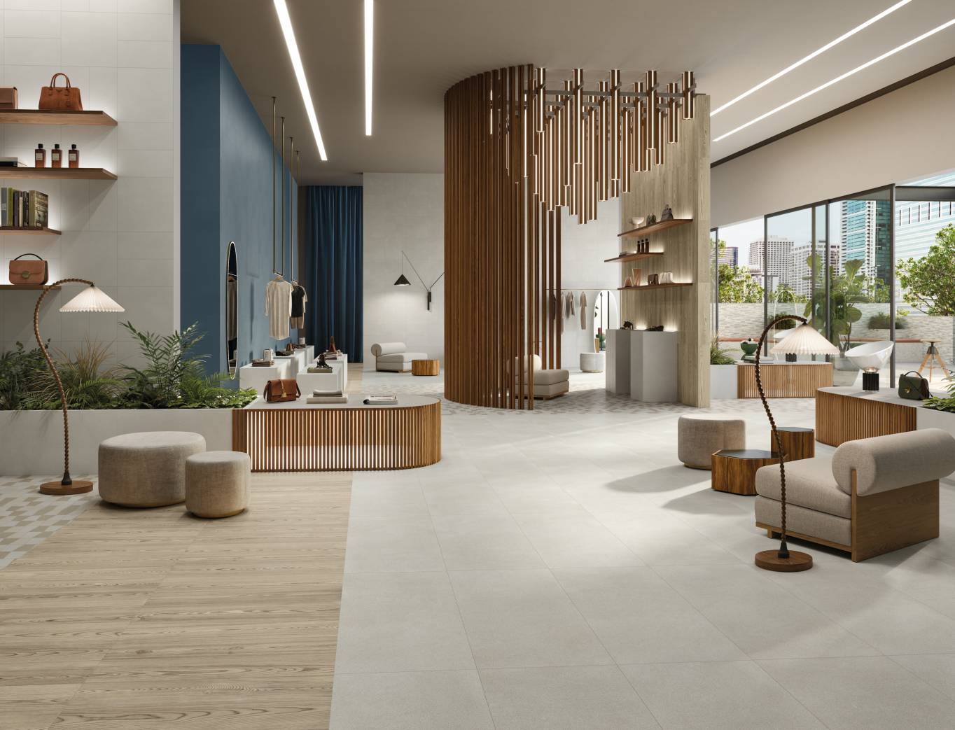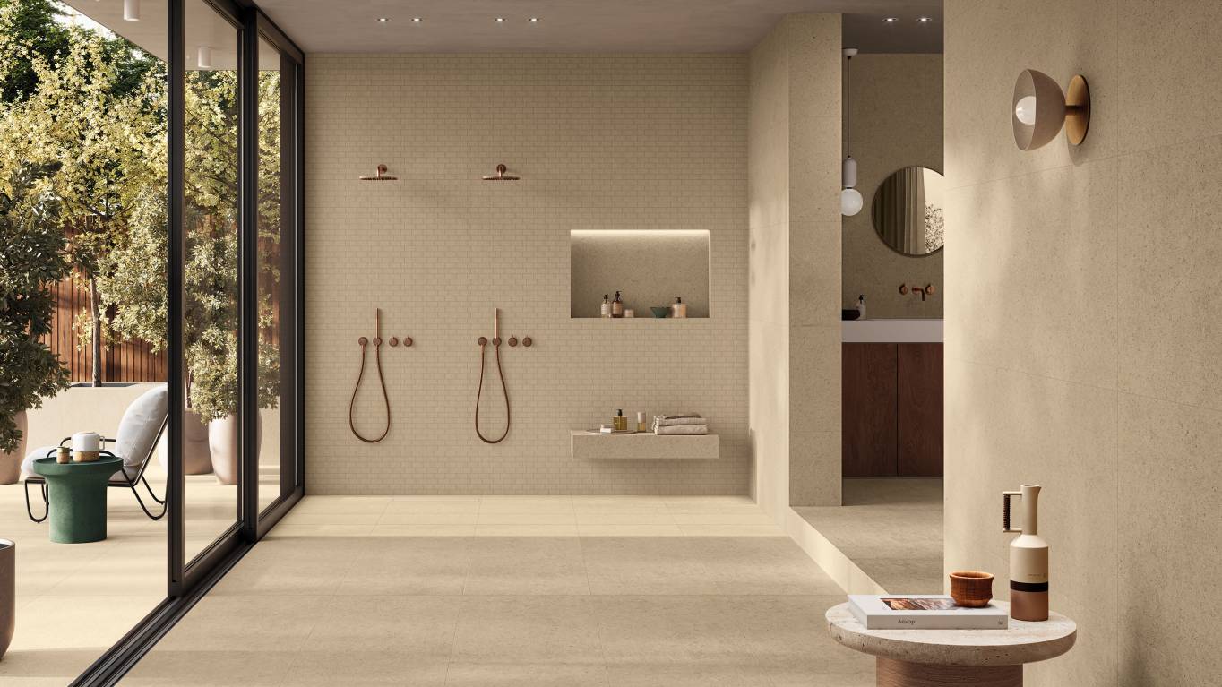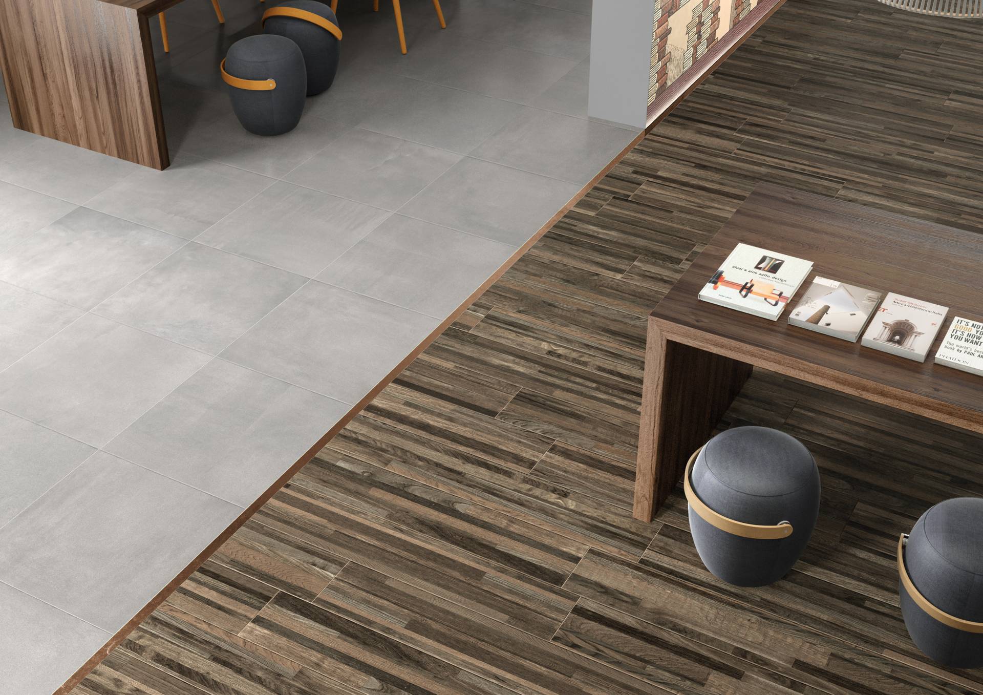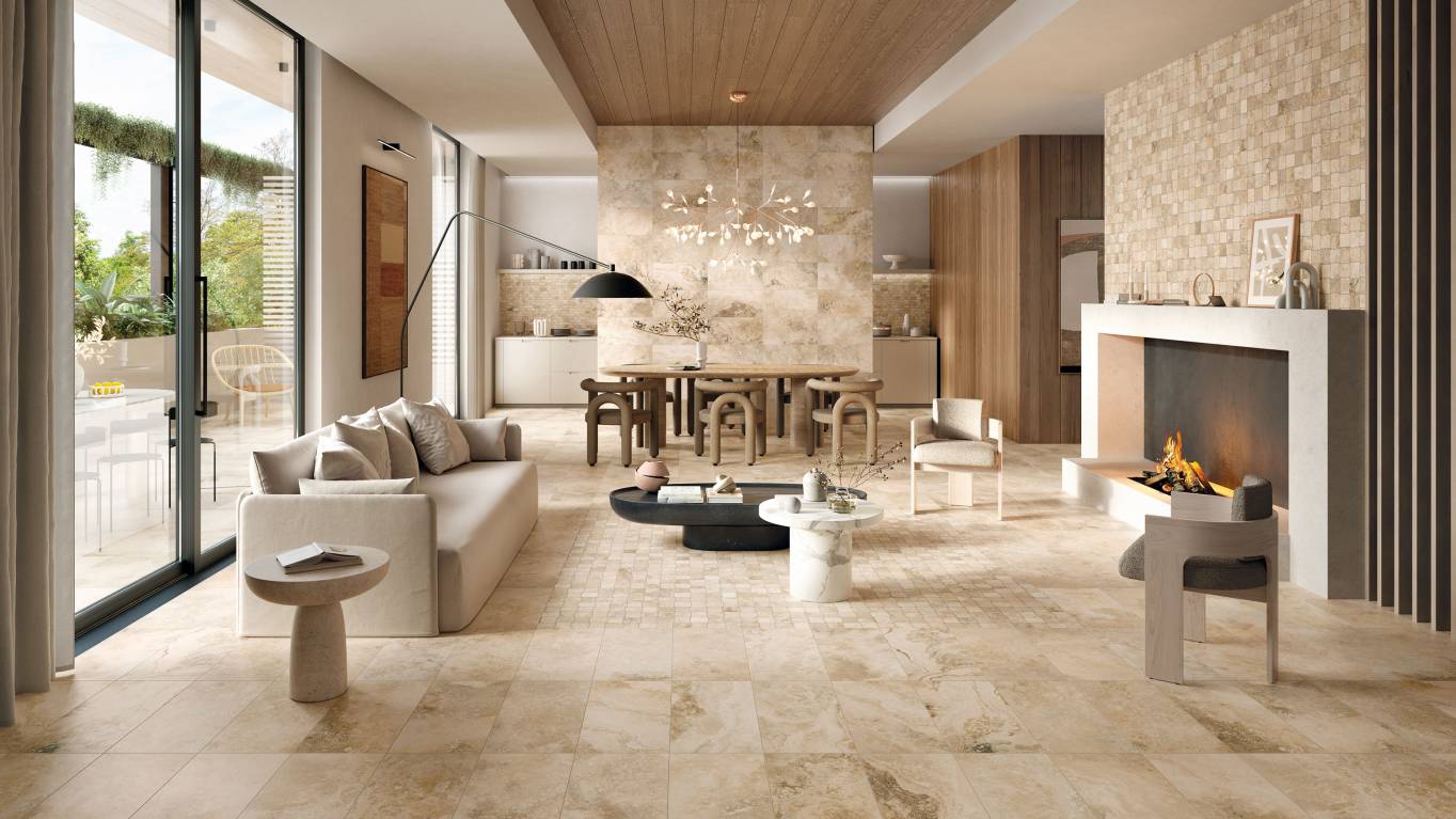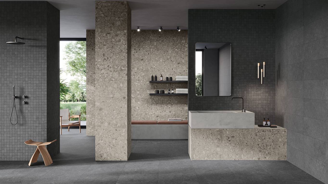 A complete surface system made to combine and mix contemporary looks such as wood, fabric, resin, terrazzo and stone looks, vivid colors, mosaics, and decors.