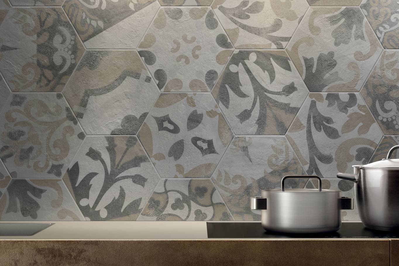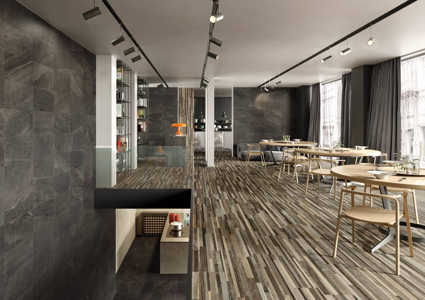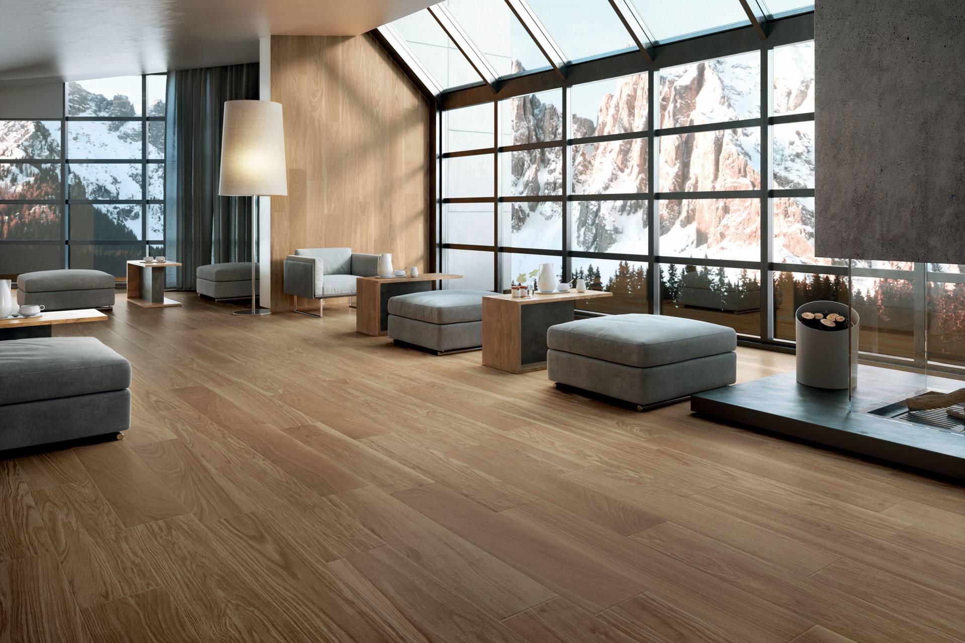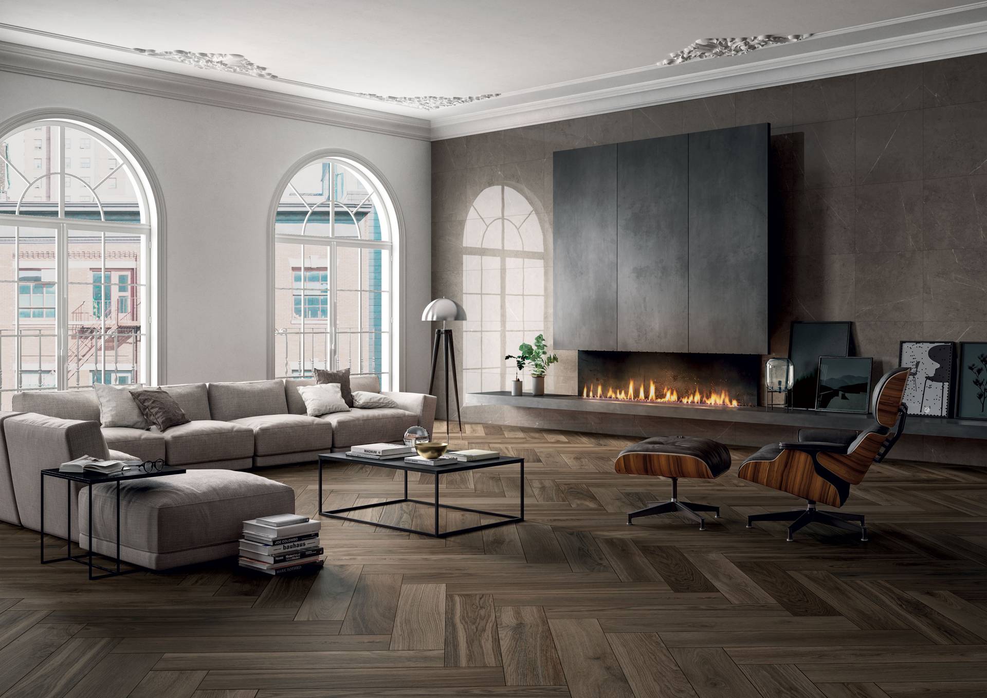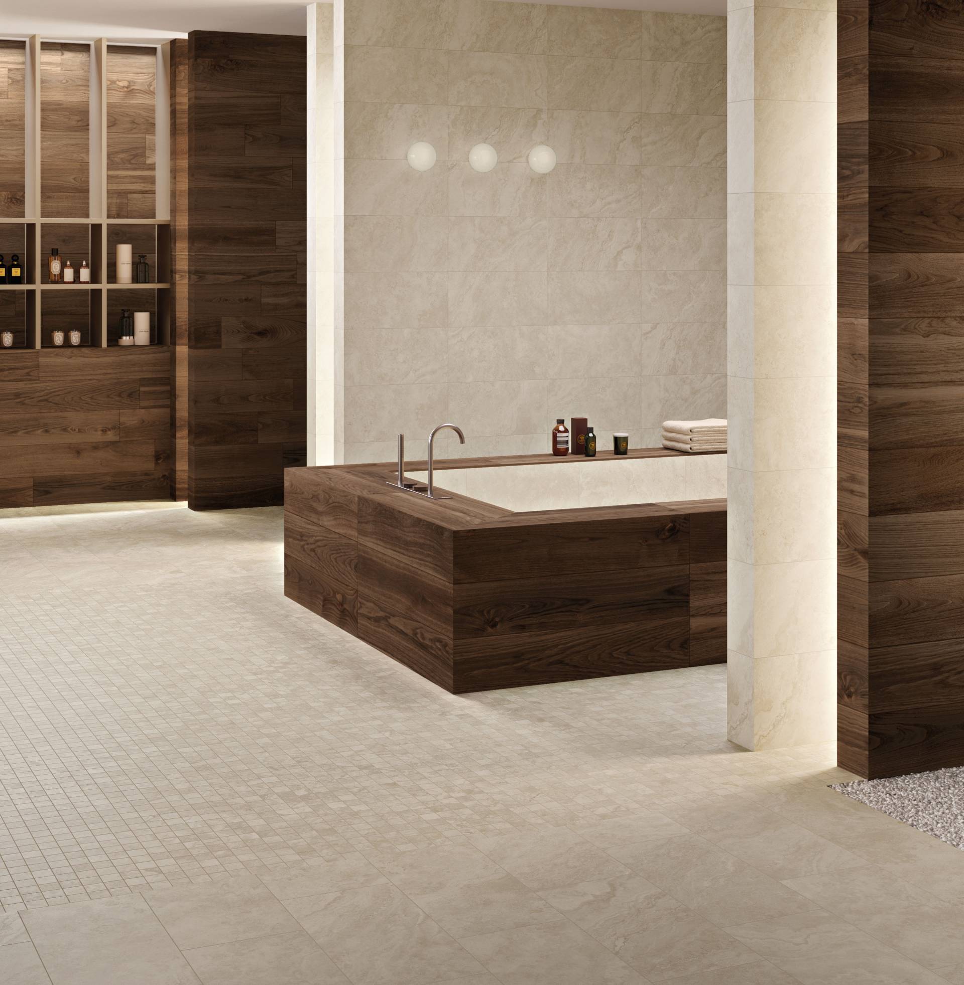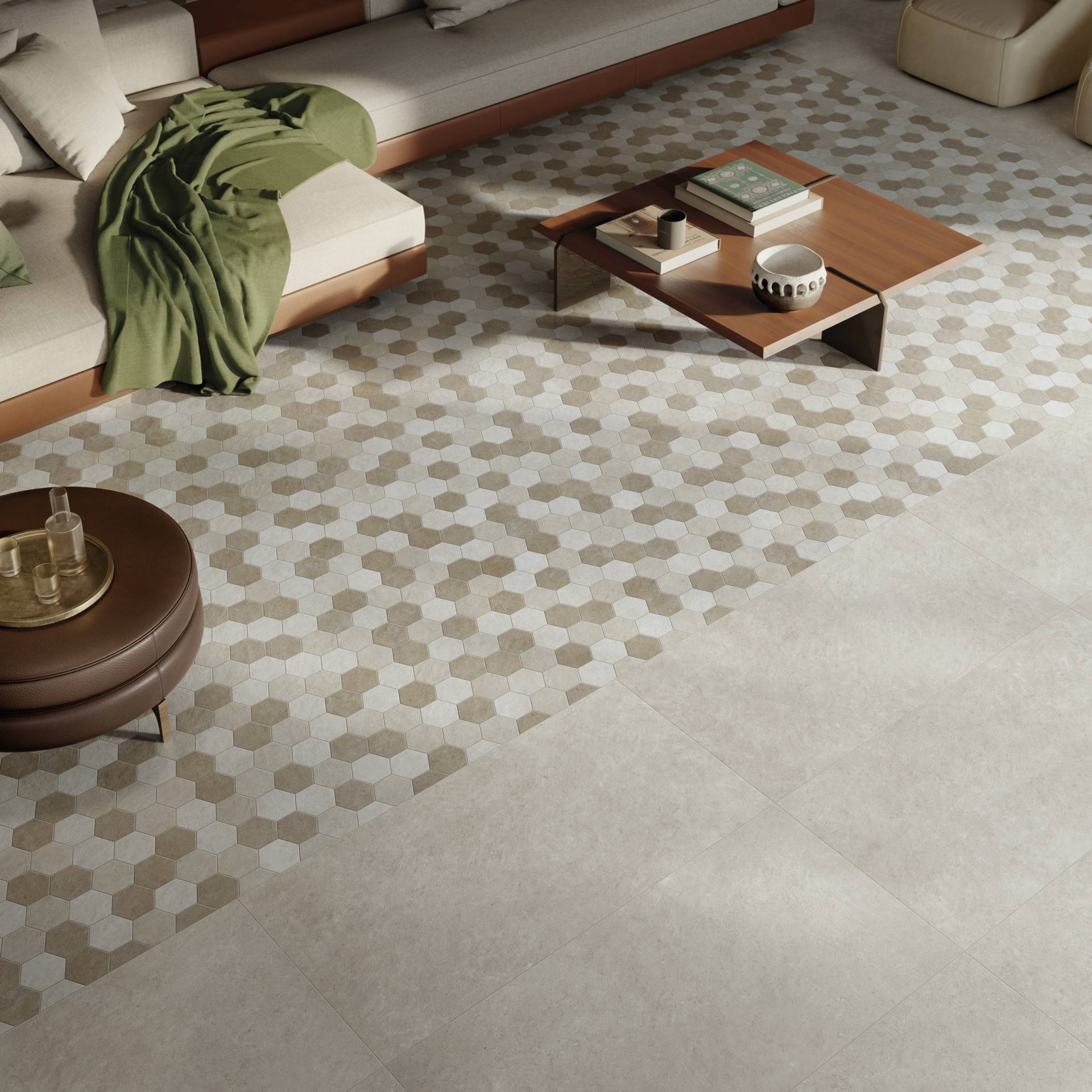 A complete surface system made to combine and mix contemporary looks such as wood, fabric, resin, terrazzo and stone looks, vivid colors, mosaics, and decors.