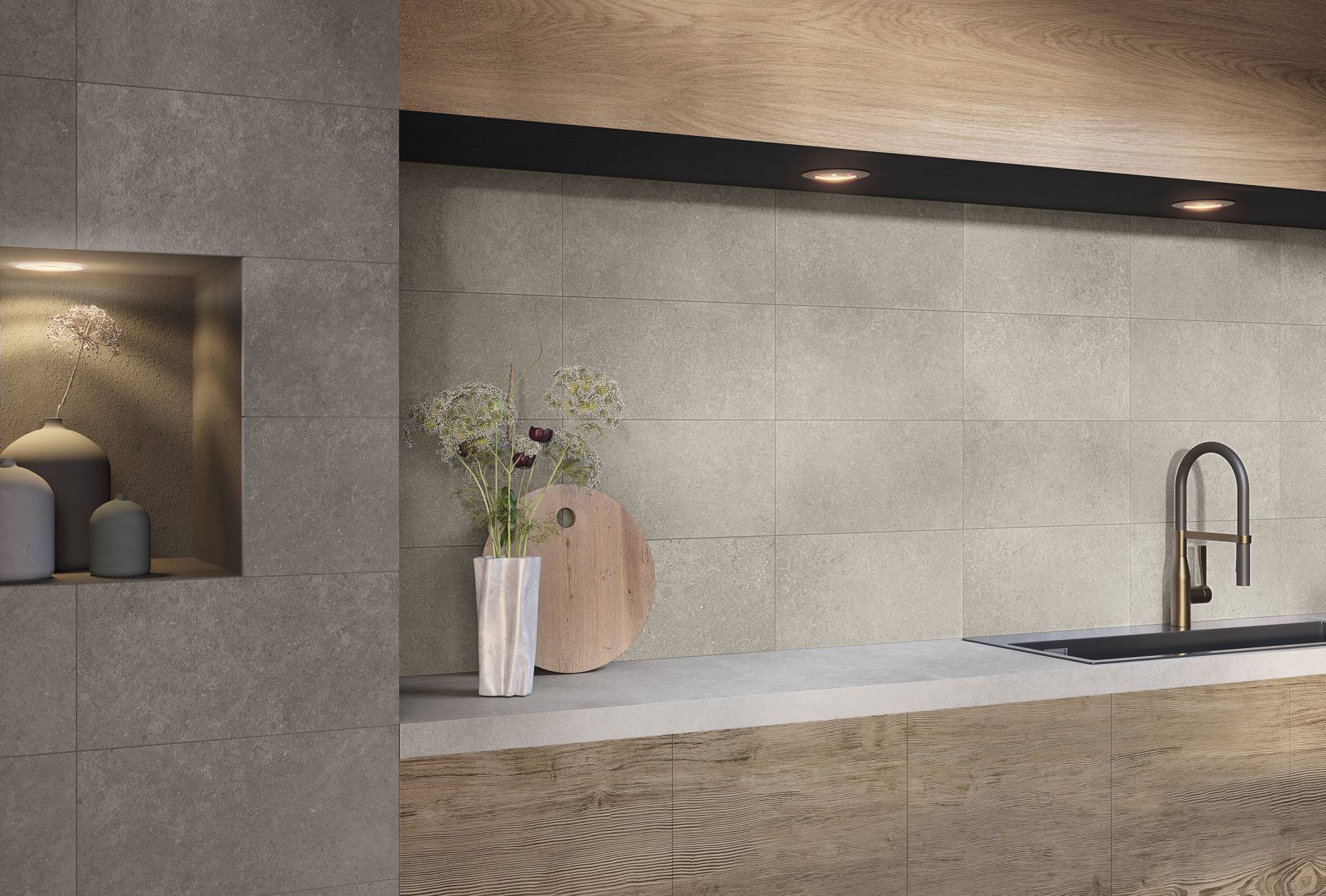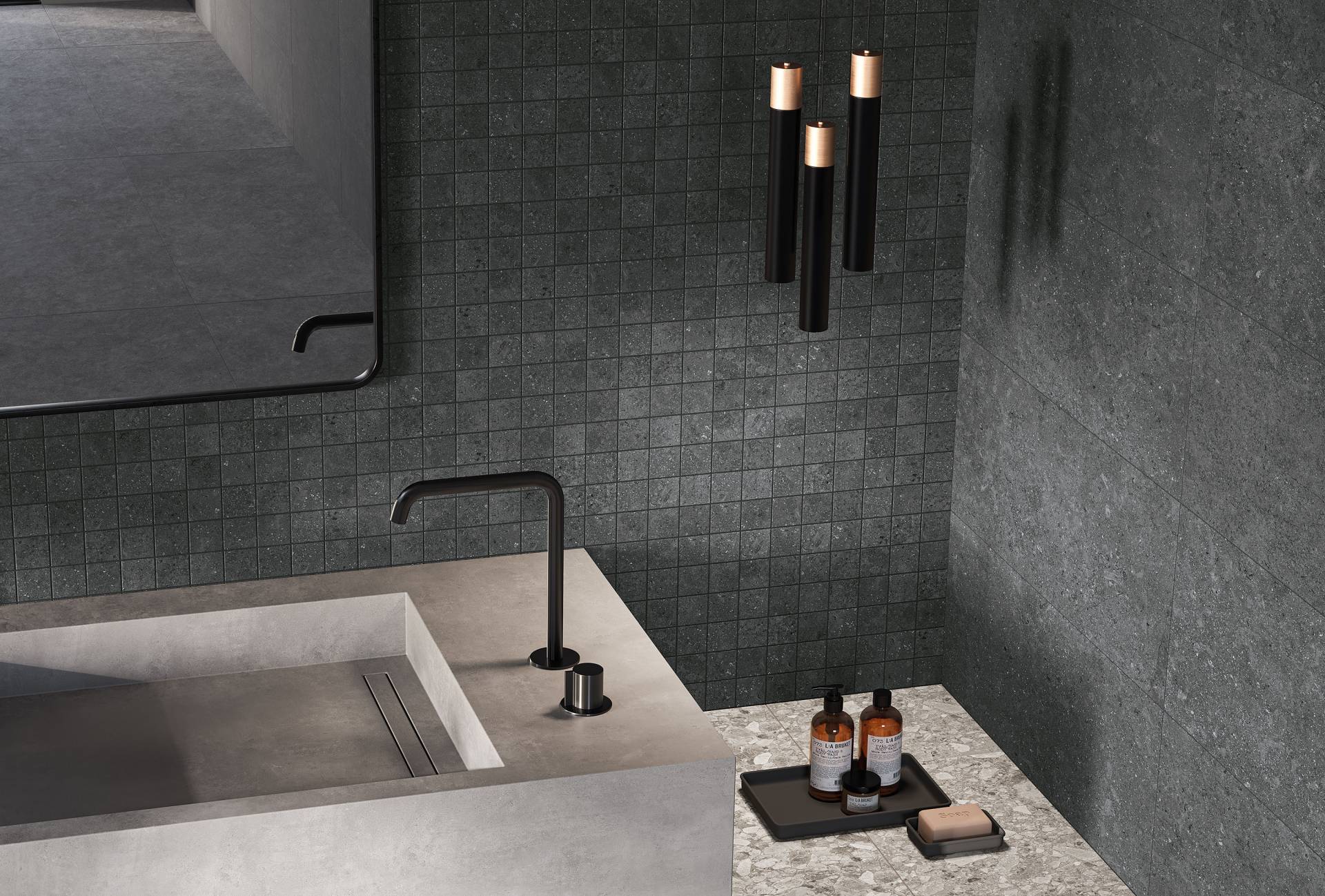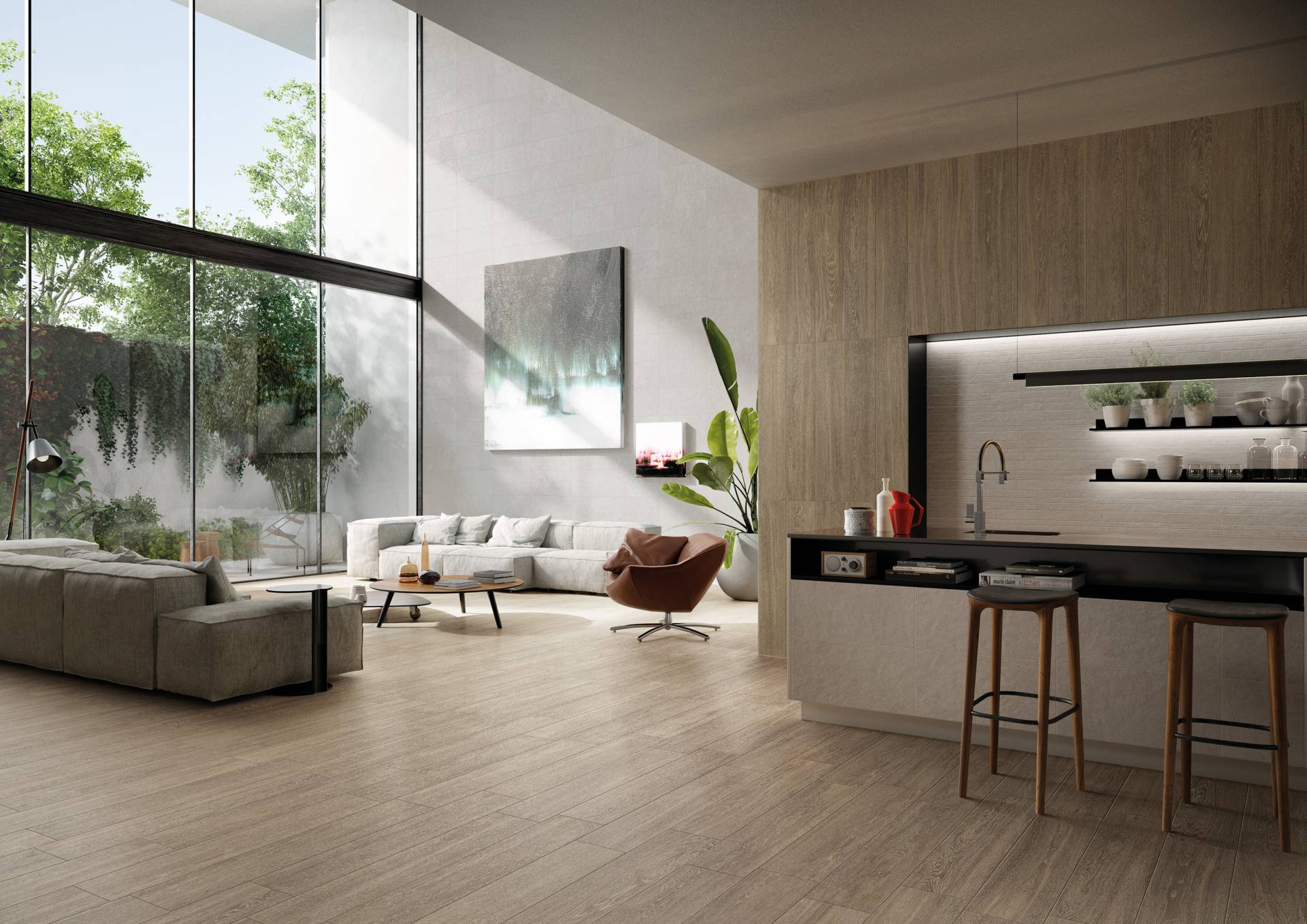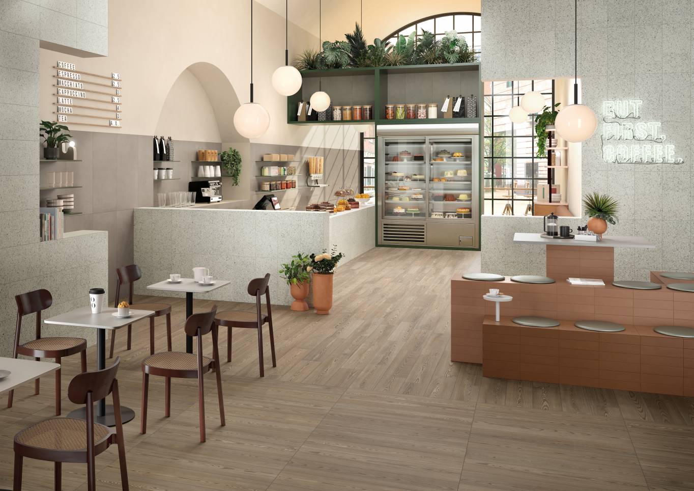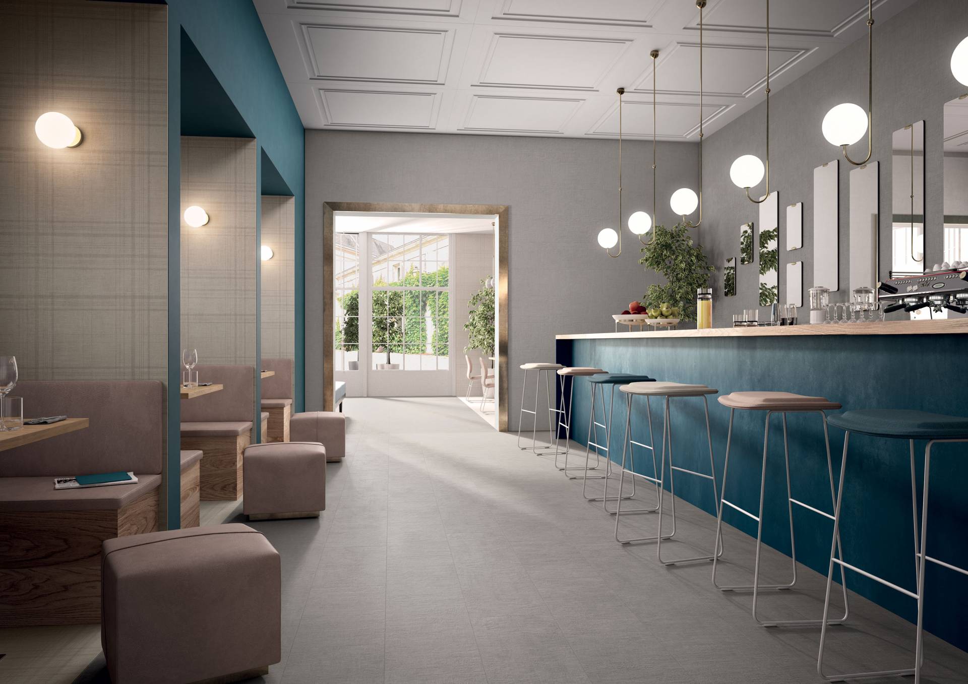 A complete surface system made to combine and mix contemporary looks such as wood, fabric, resin, terrazzo and stone looks, vivid colors, mosaics, and decors.