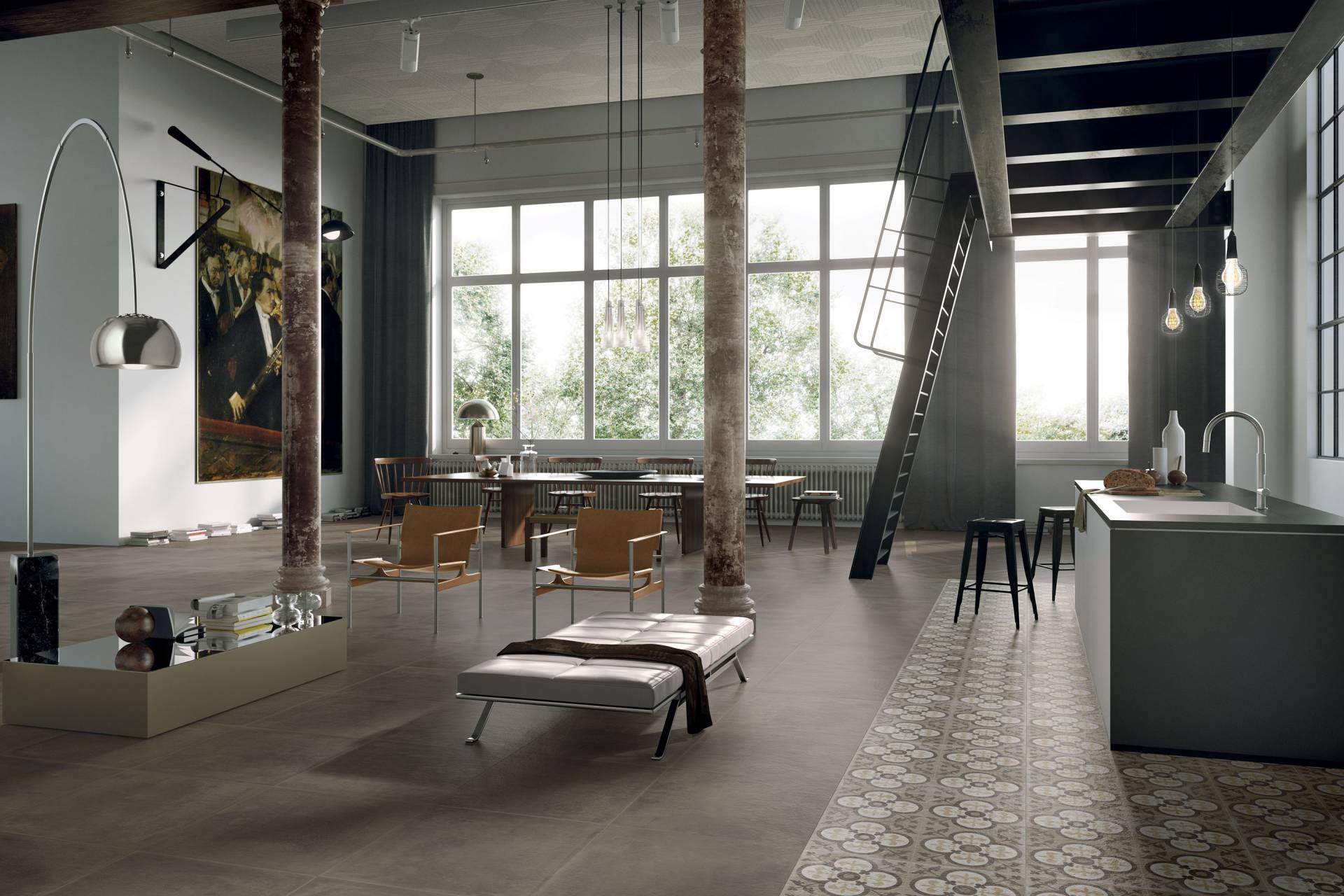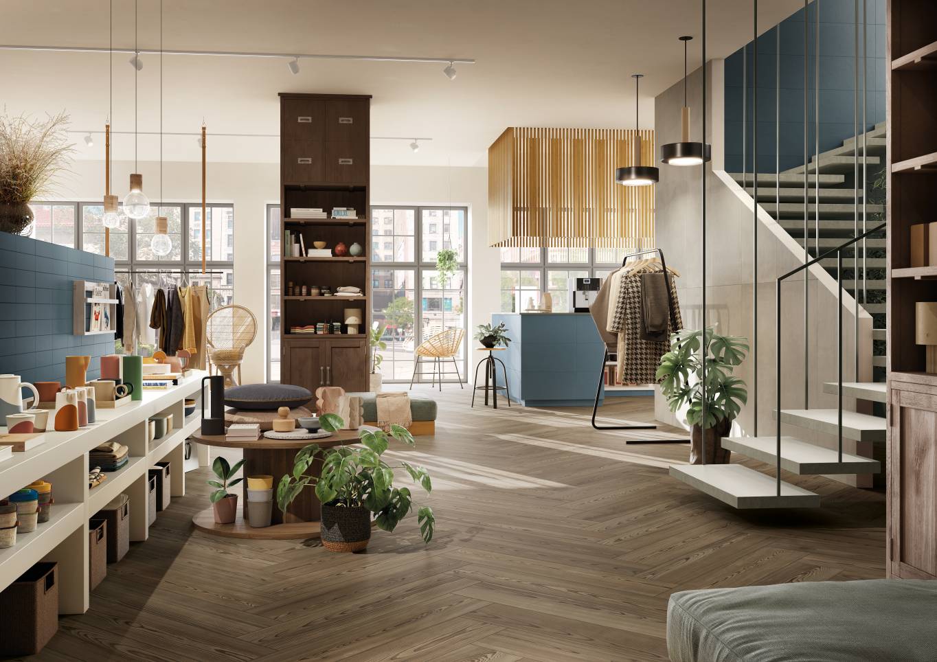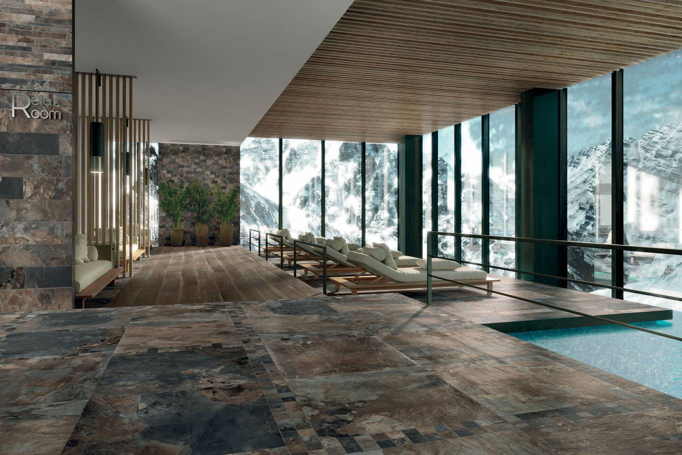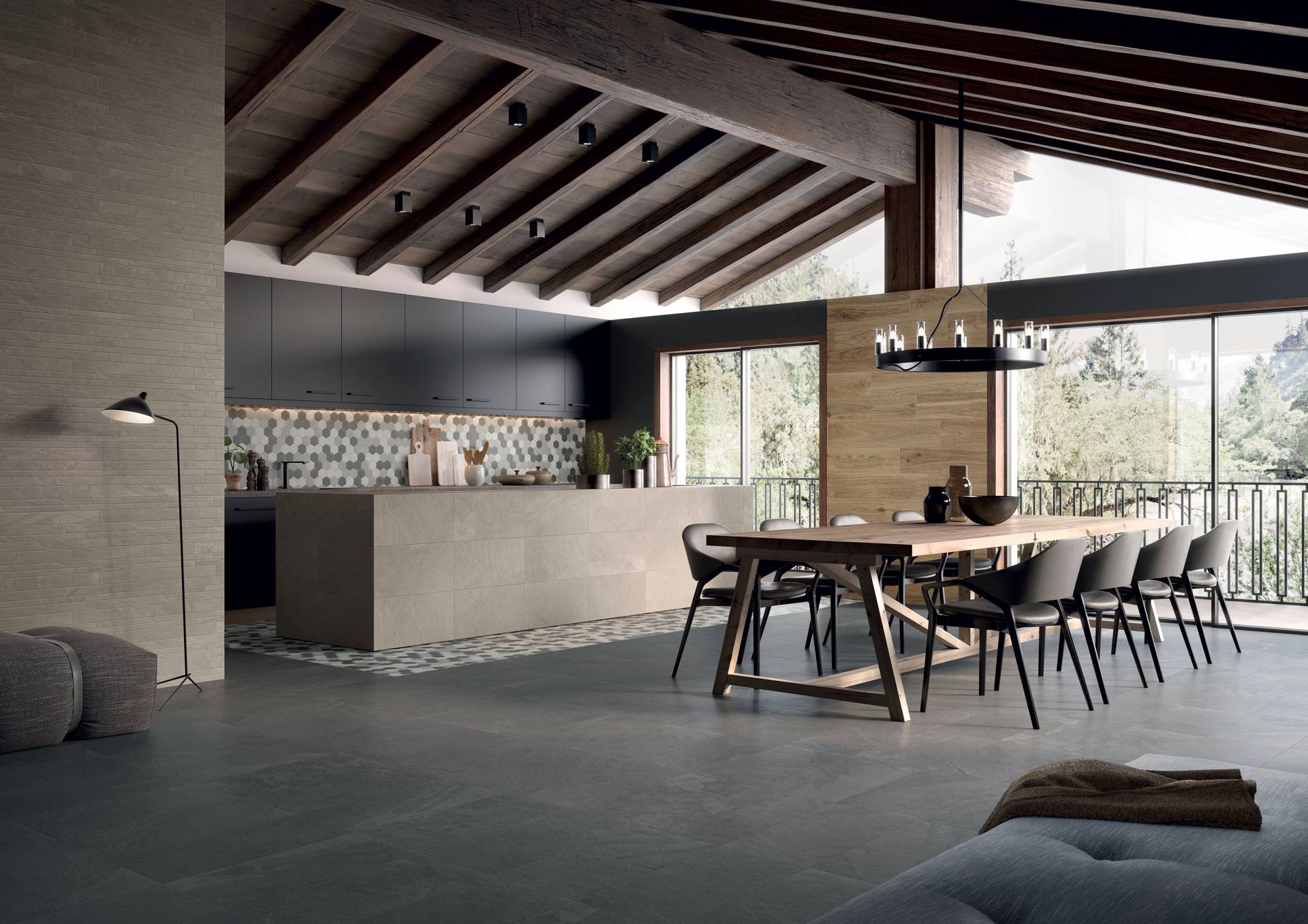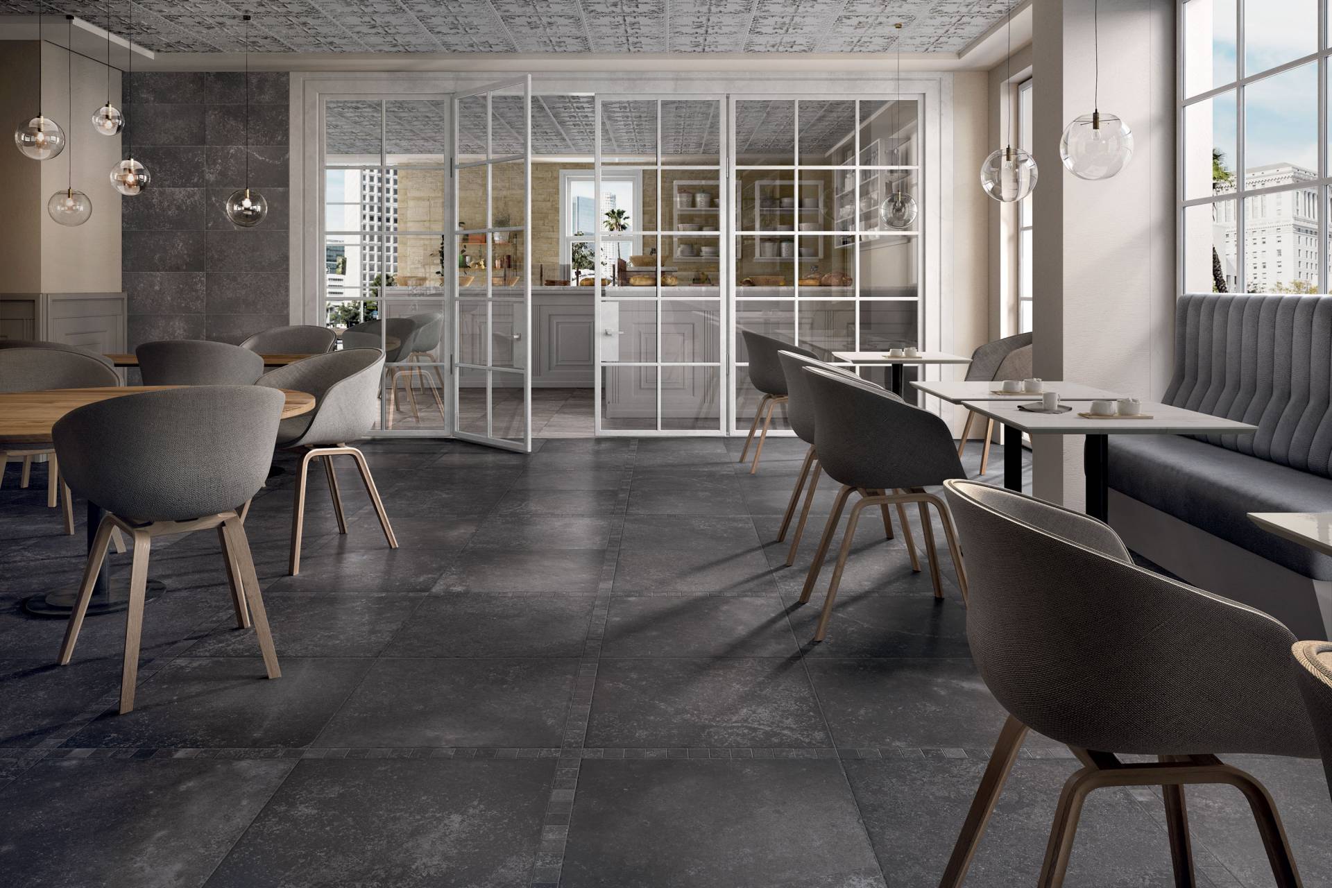 A complete surface system made to combine and mix contemporary looks such as wood, fabric, resin, terrazzo and stone looks, vivid colors, mosaics, and decors.