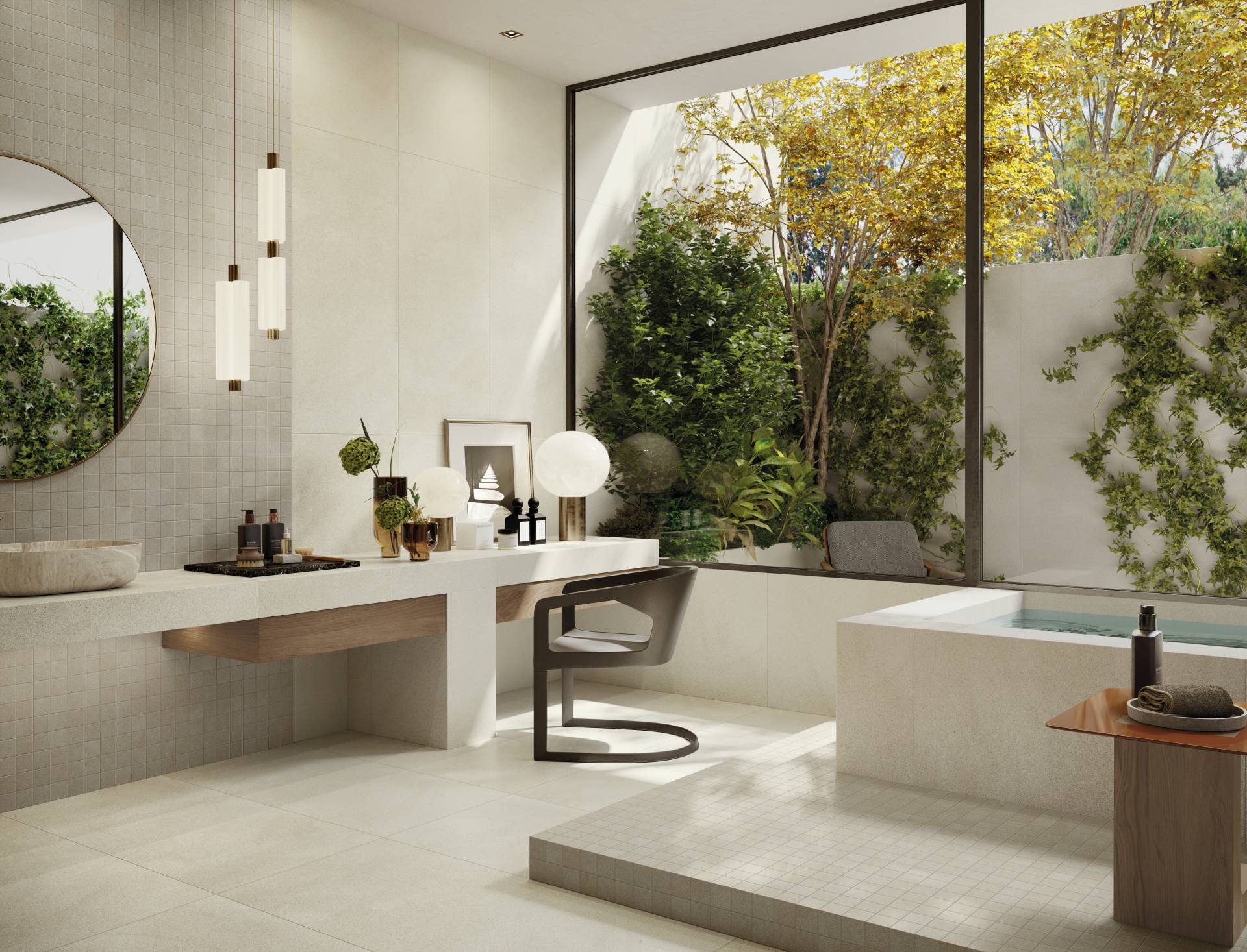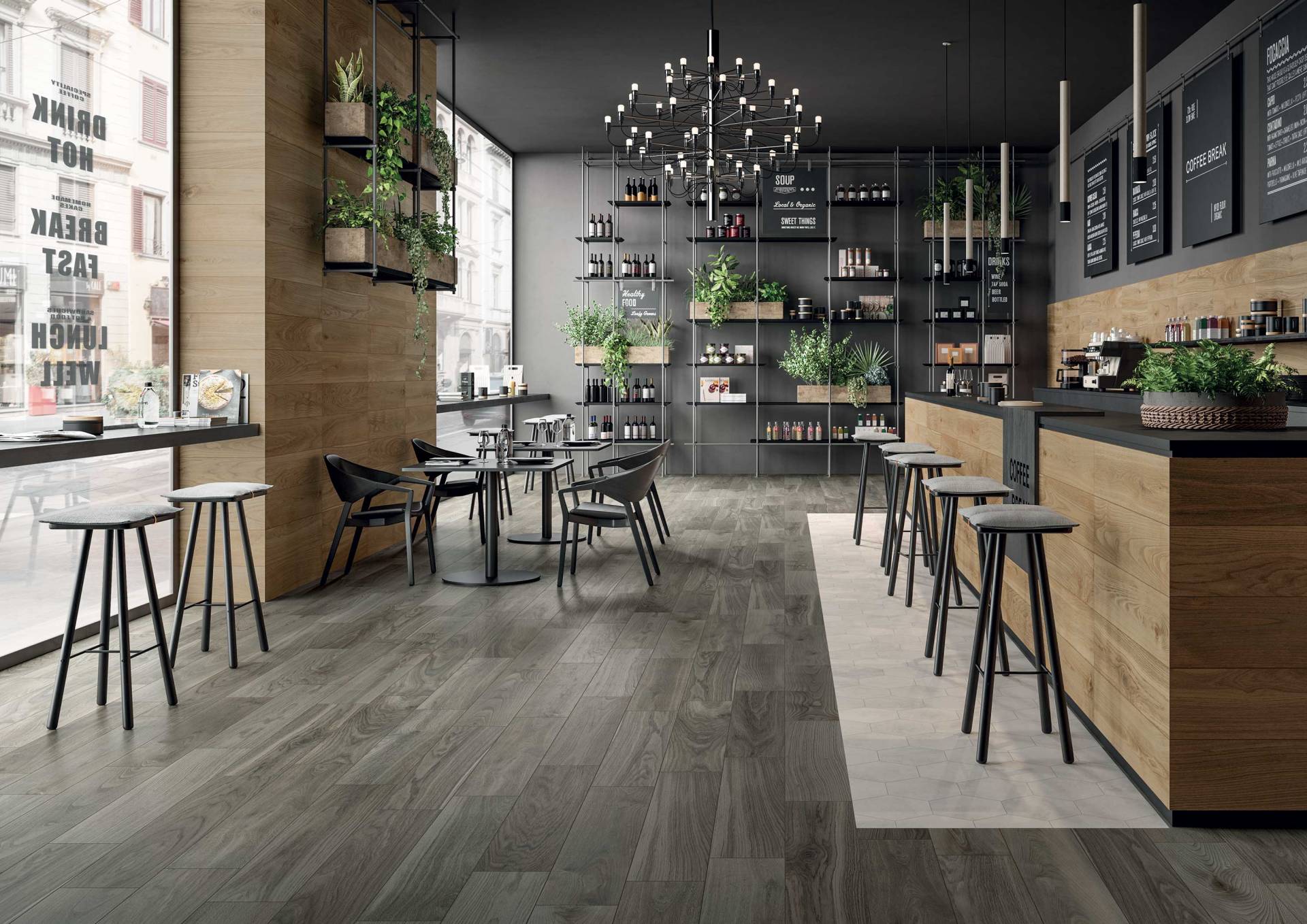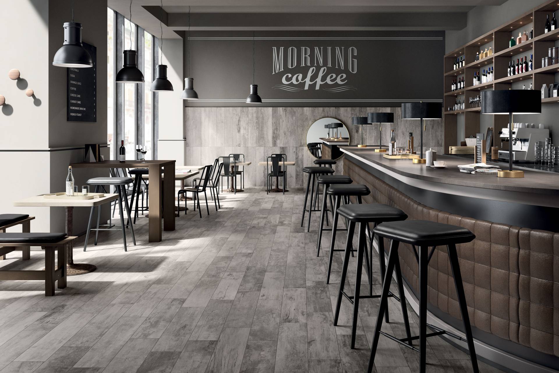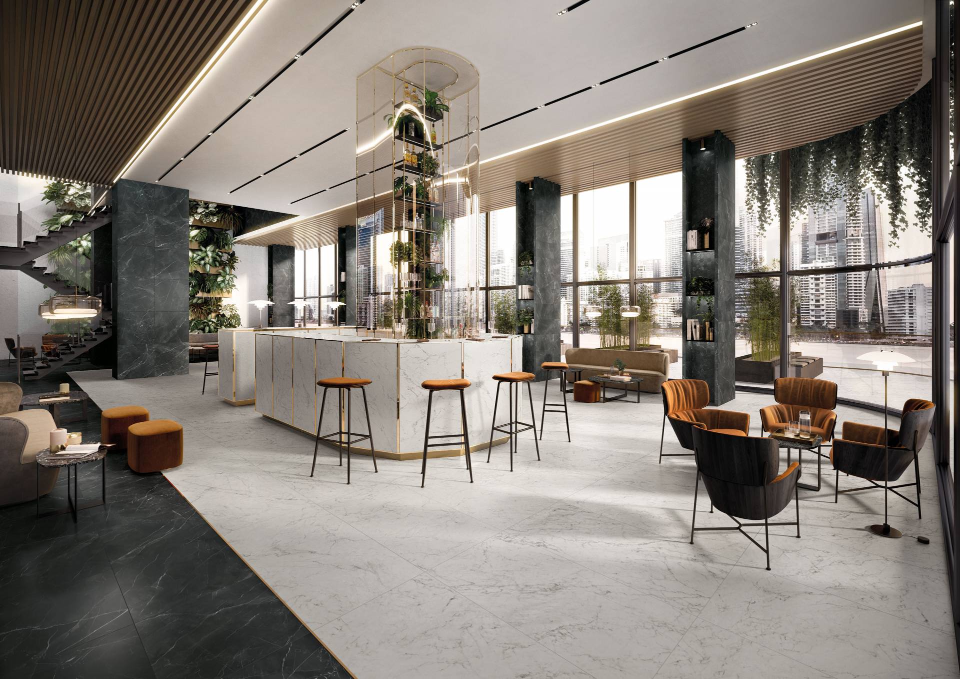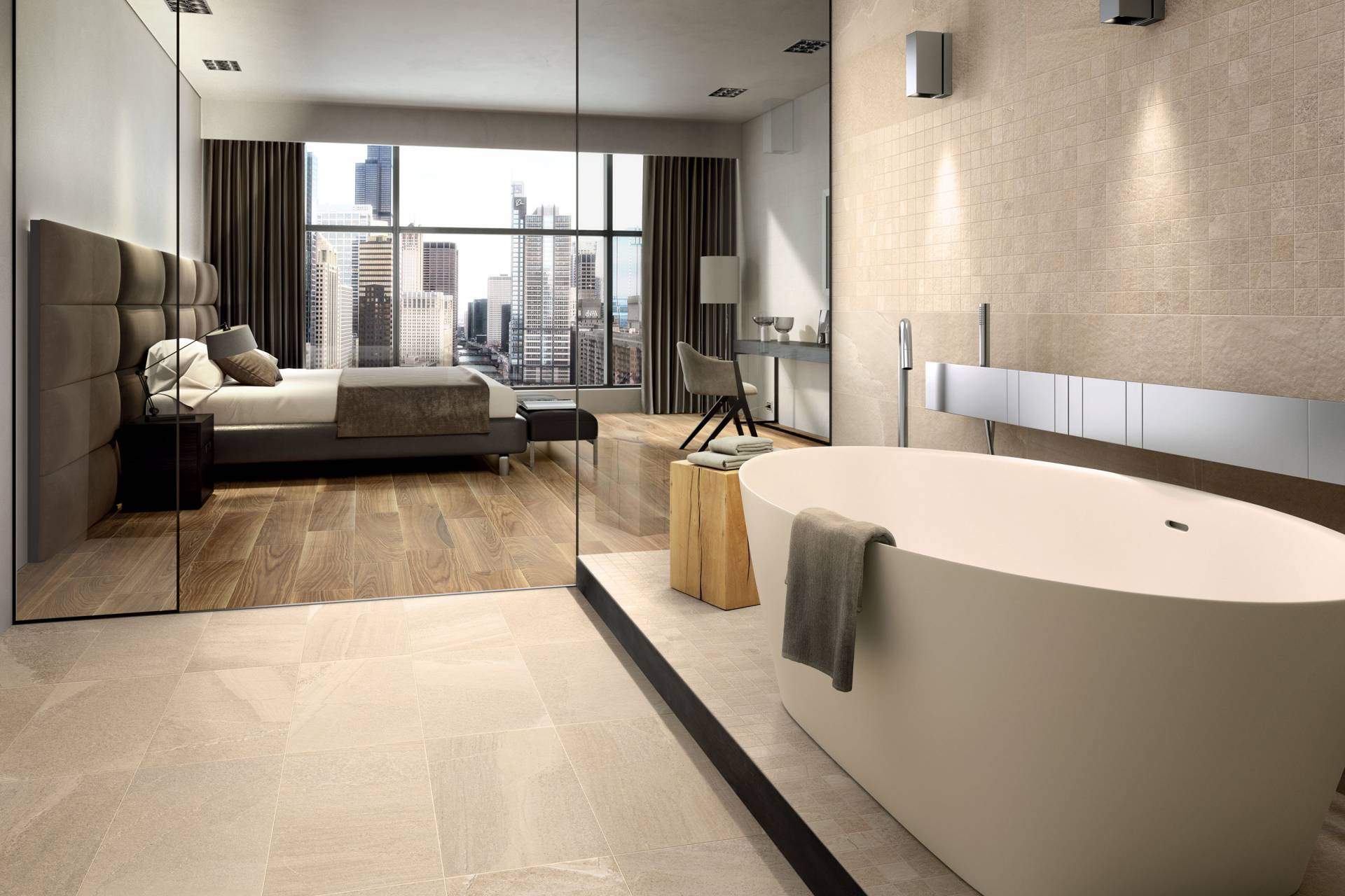 A complete surface system made to combine and mix contemporary looks such as wood, fabric, resin, terrazzo and stone looks, vivid colors, mosaics, and decors.