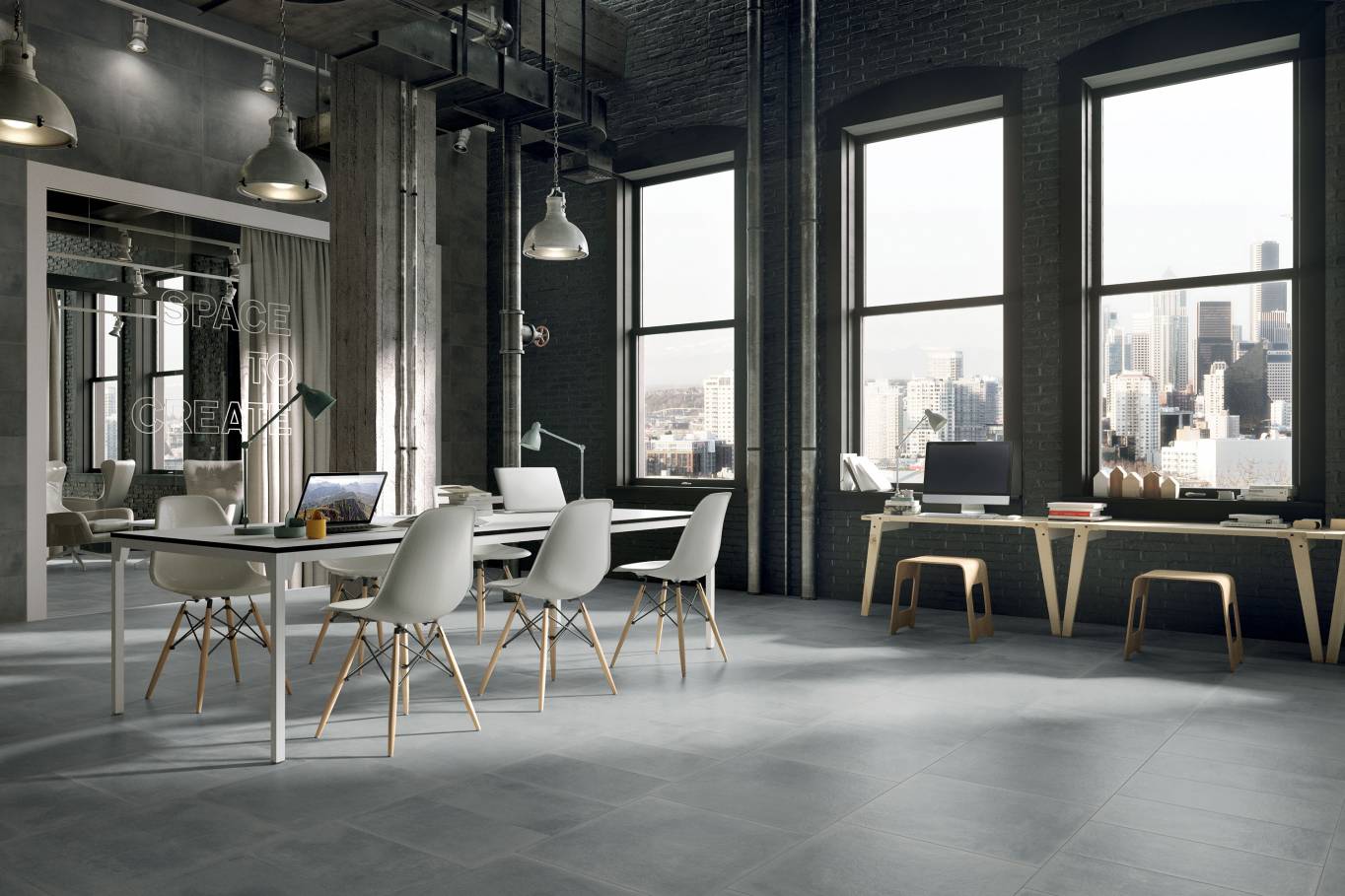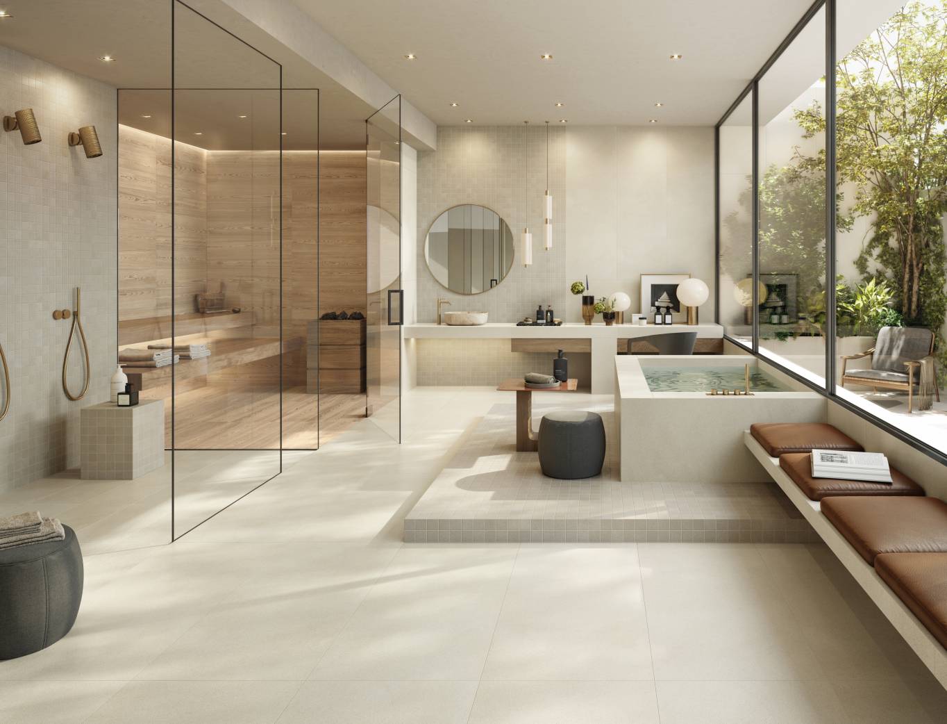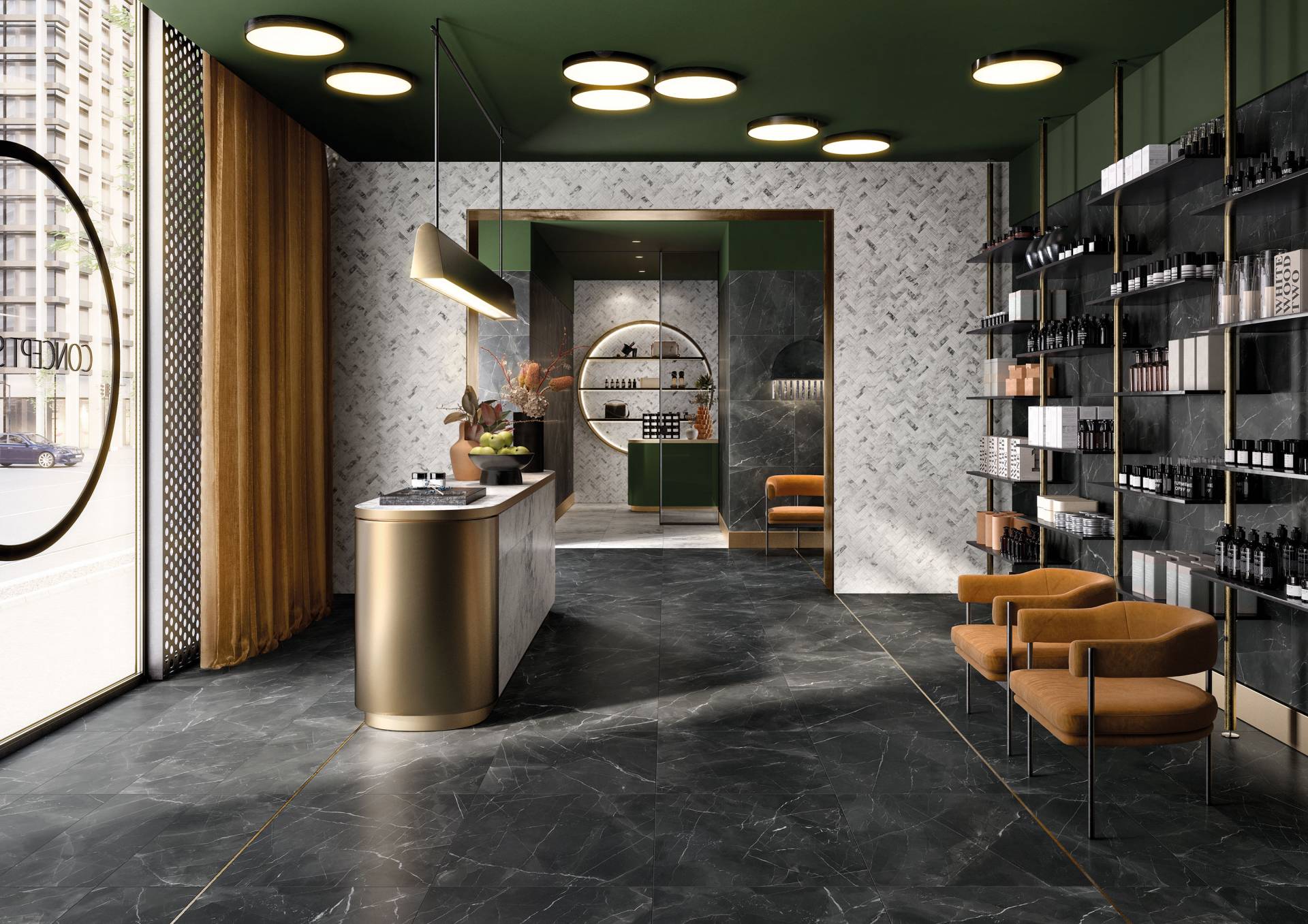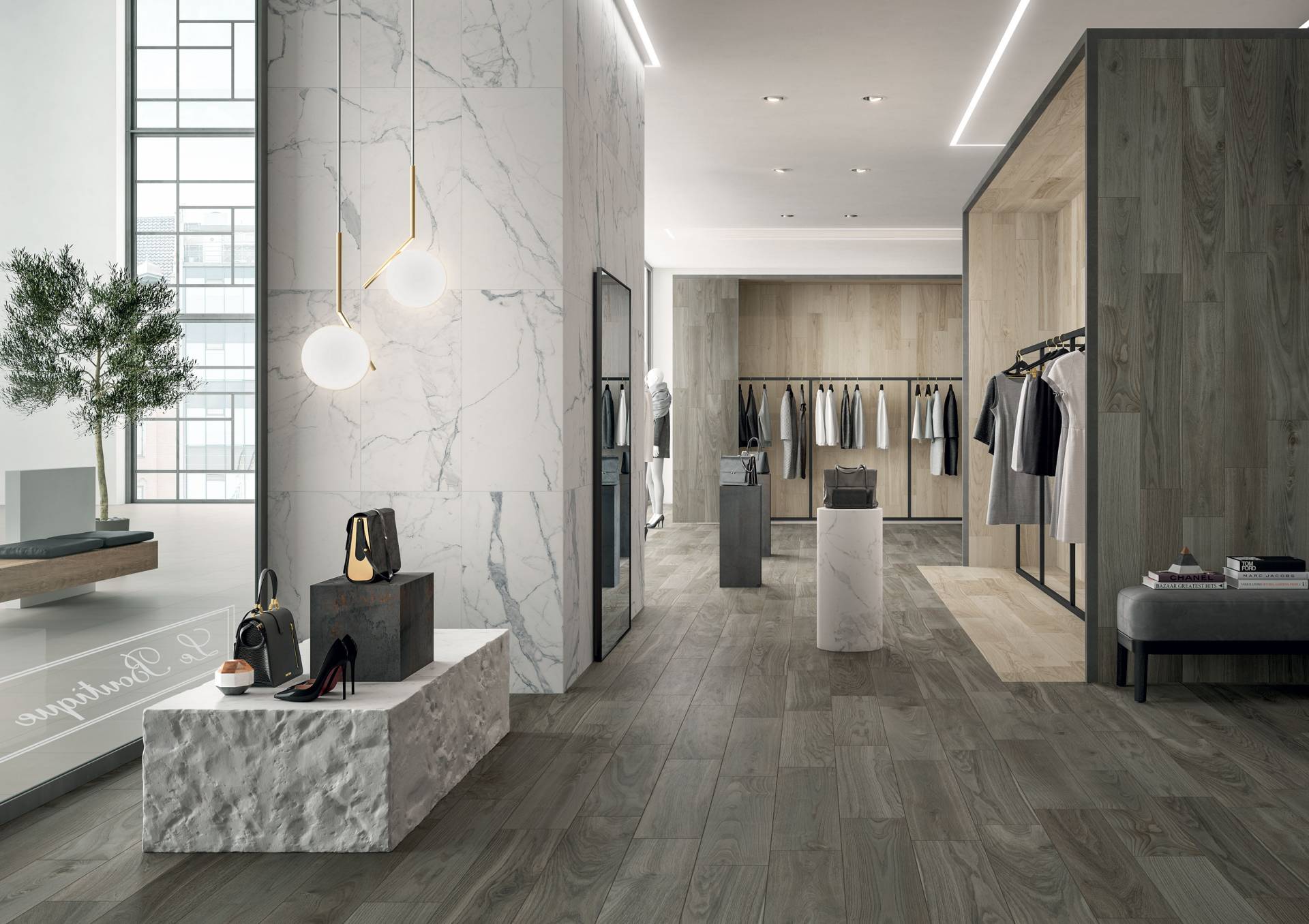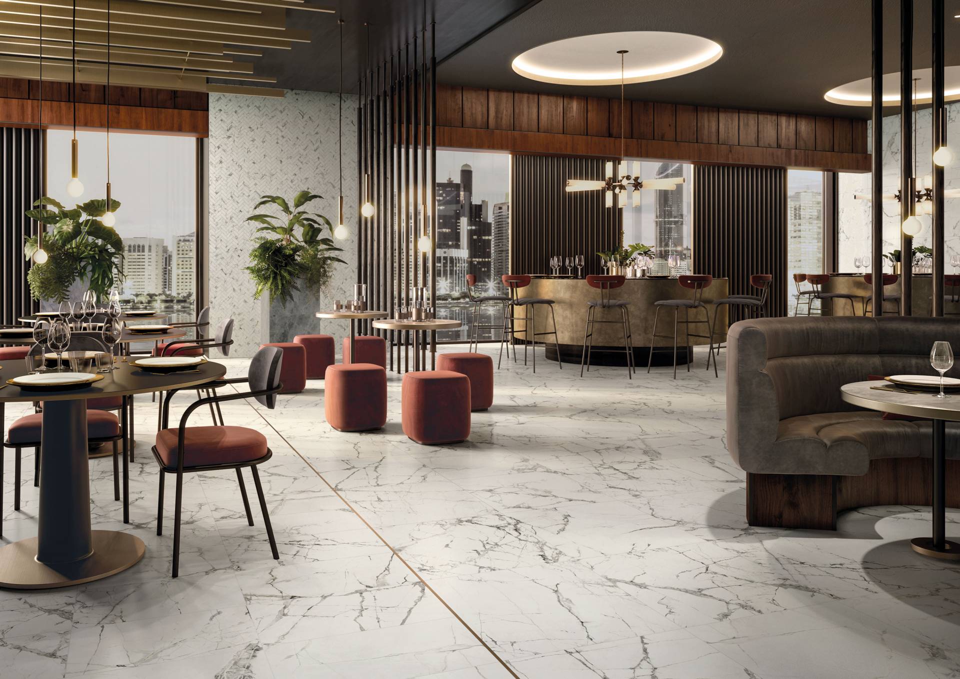 A complete surface system made to combine and mix contemporary looks such as wood, fabric, resin, terrazzo and stone looks, vivid colors, mosaics, and decors.