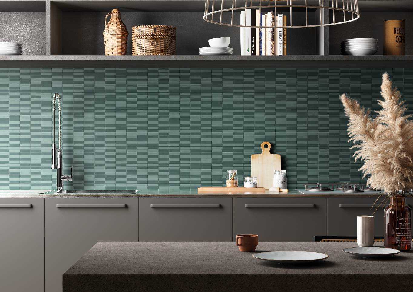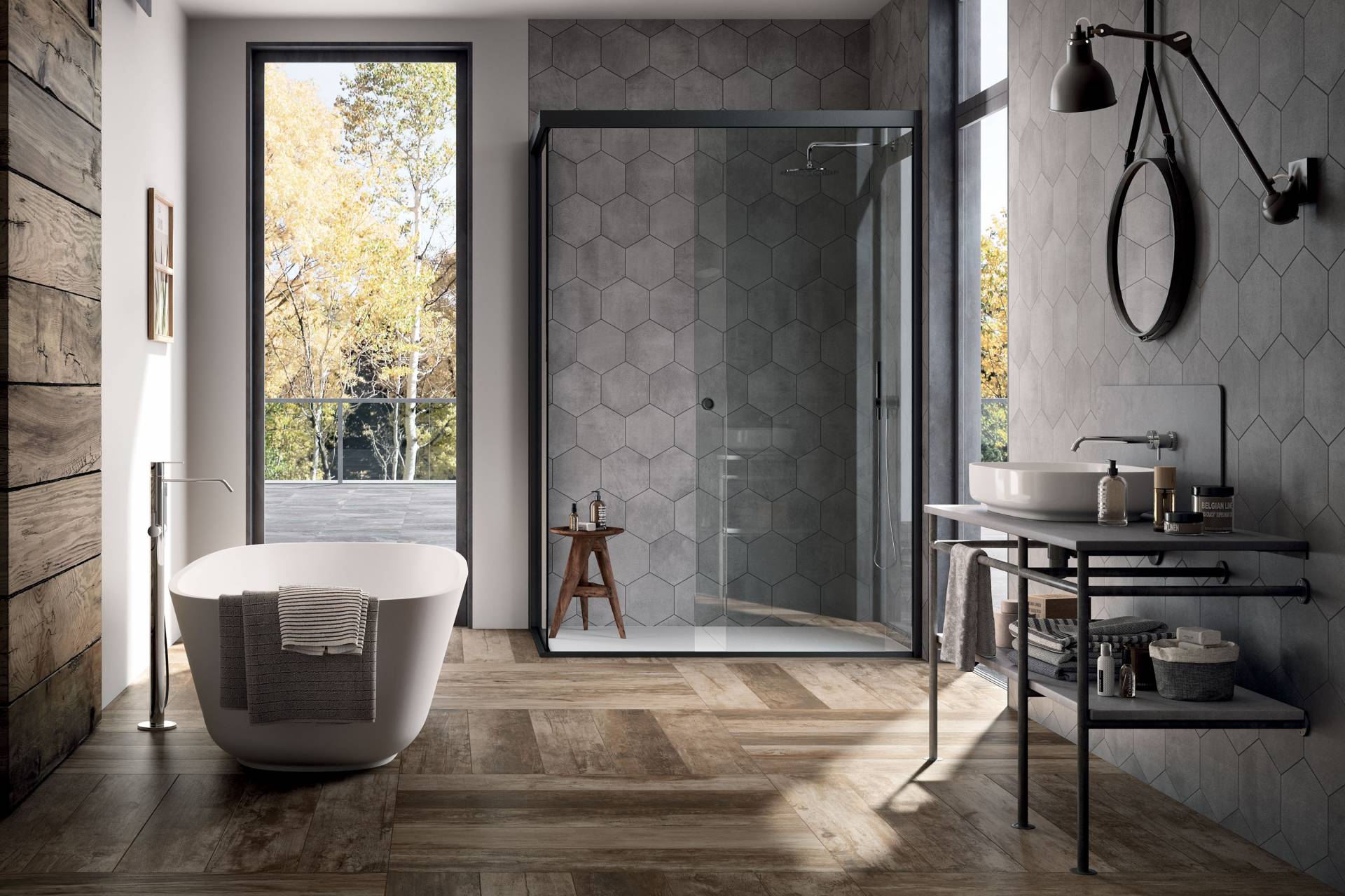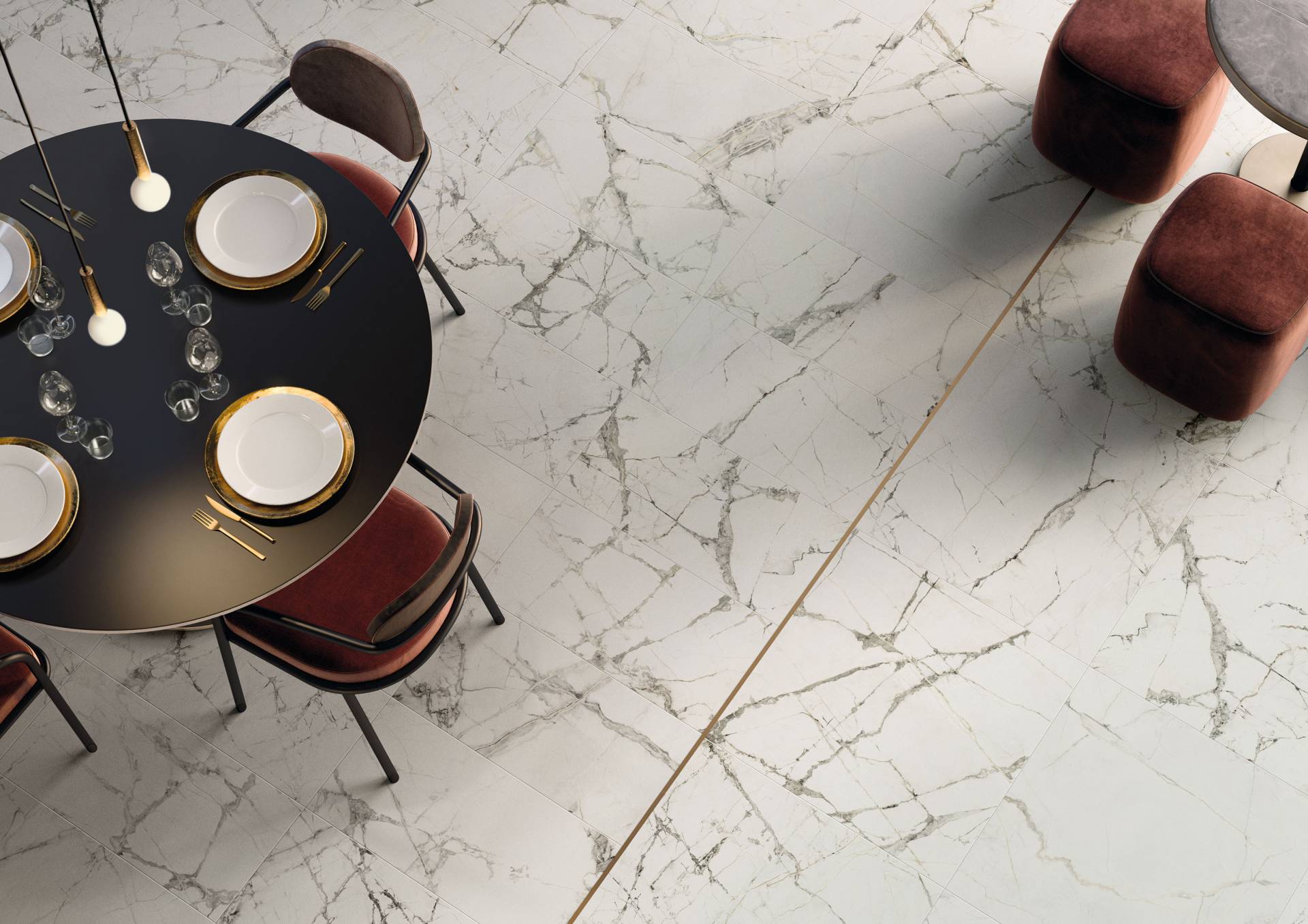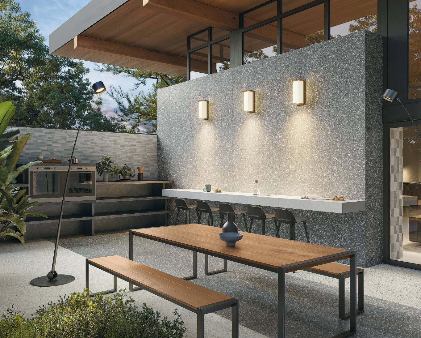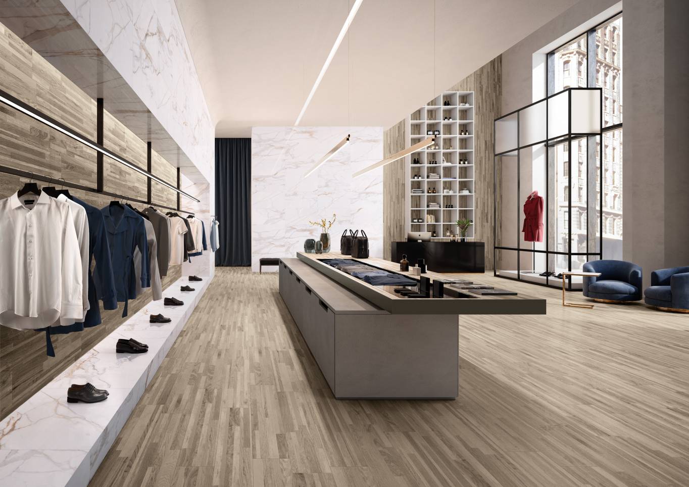 A complete surface system made to combine and mix contemporary looks such as wood, fabric, resin, terrazzo and stone looks, vivid colors, mosaics, and decors.