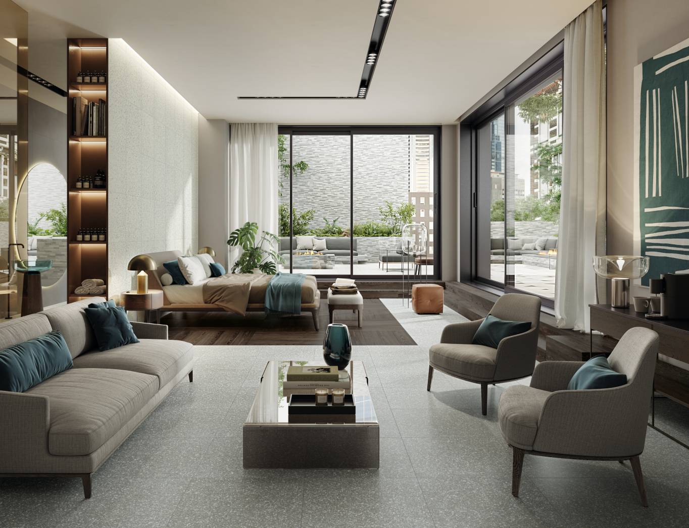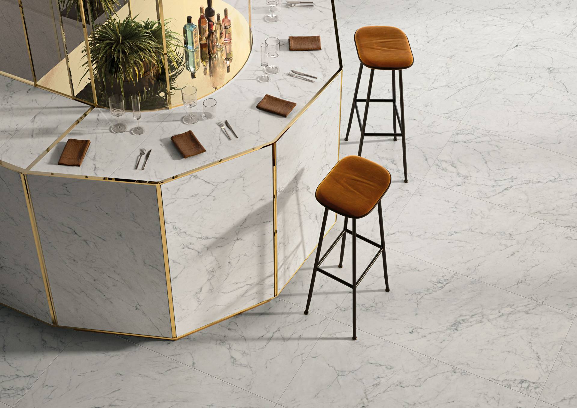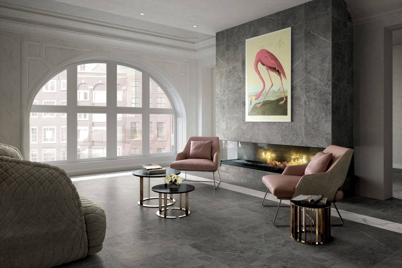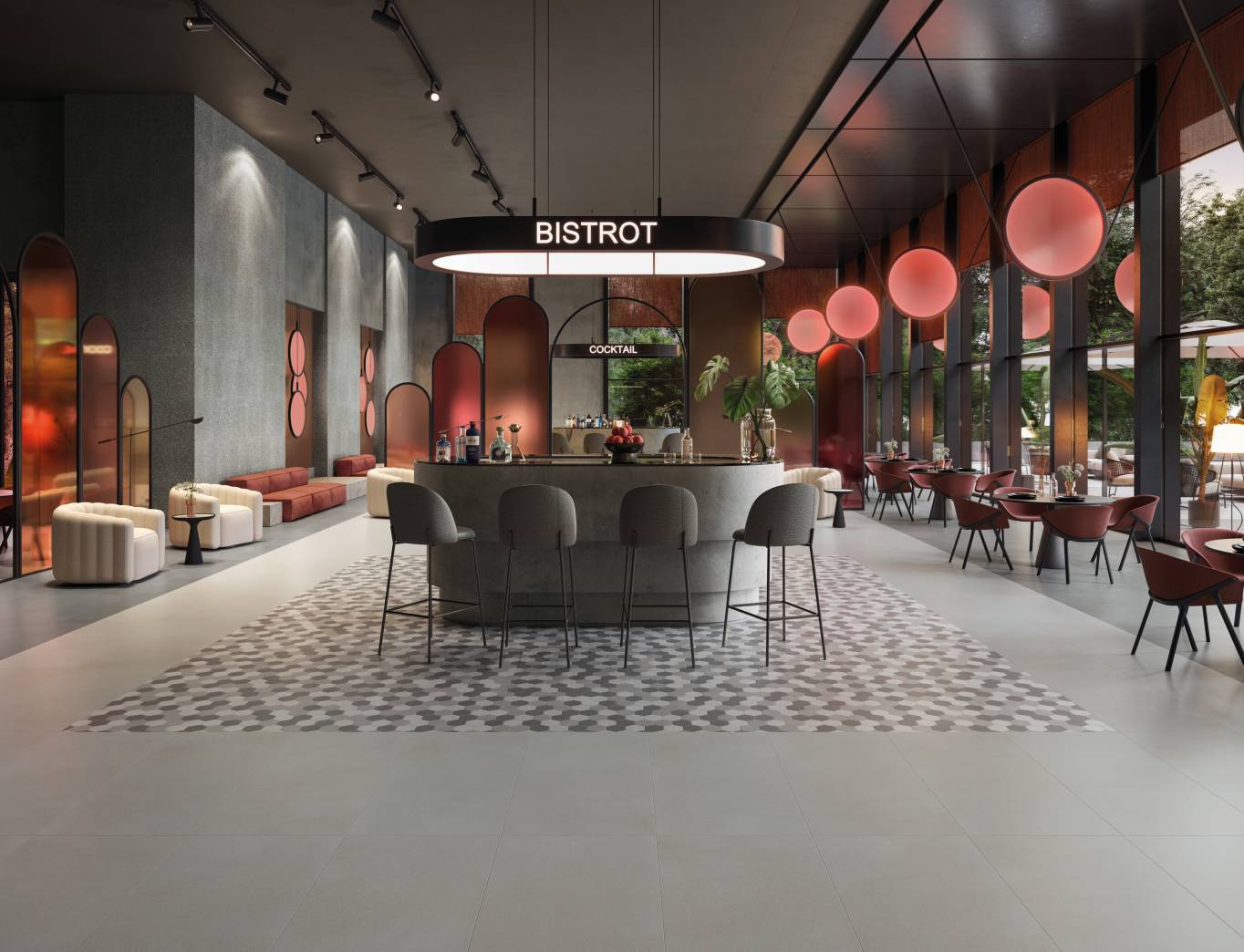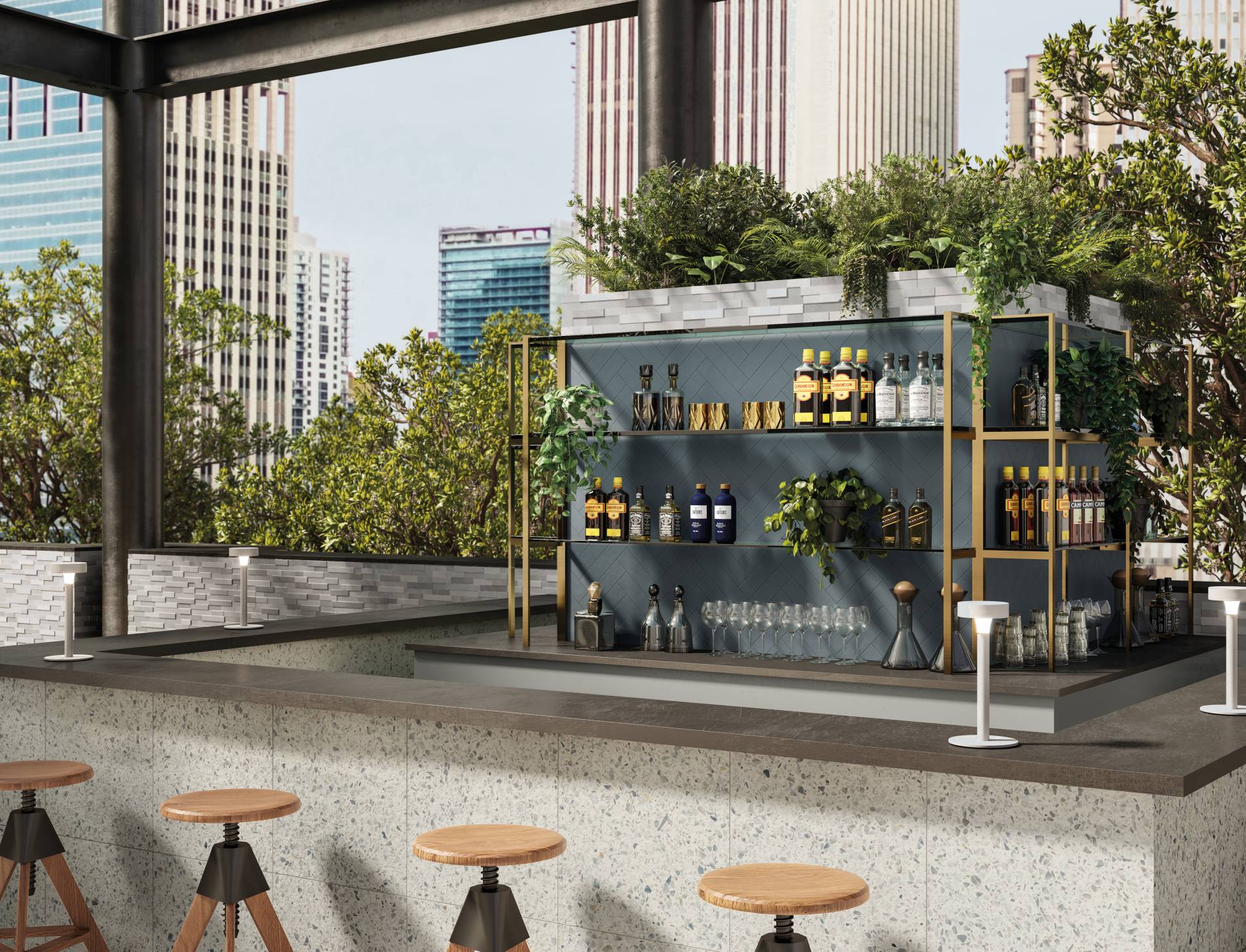 A complete surface system made to combine and mix contemporary looks such as wood, fabric, resin, terrazzo and stone looks, vivid colors, mosaics, and decors.