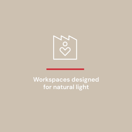 The interior environments of the plant and corporate offices are conceived to make the best use of natural light during daylight hours. This setup reduces recourse to artificial lighting and guarantees employees’ conditions of comfort and well-being on a daily basis.
